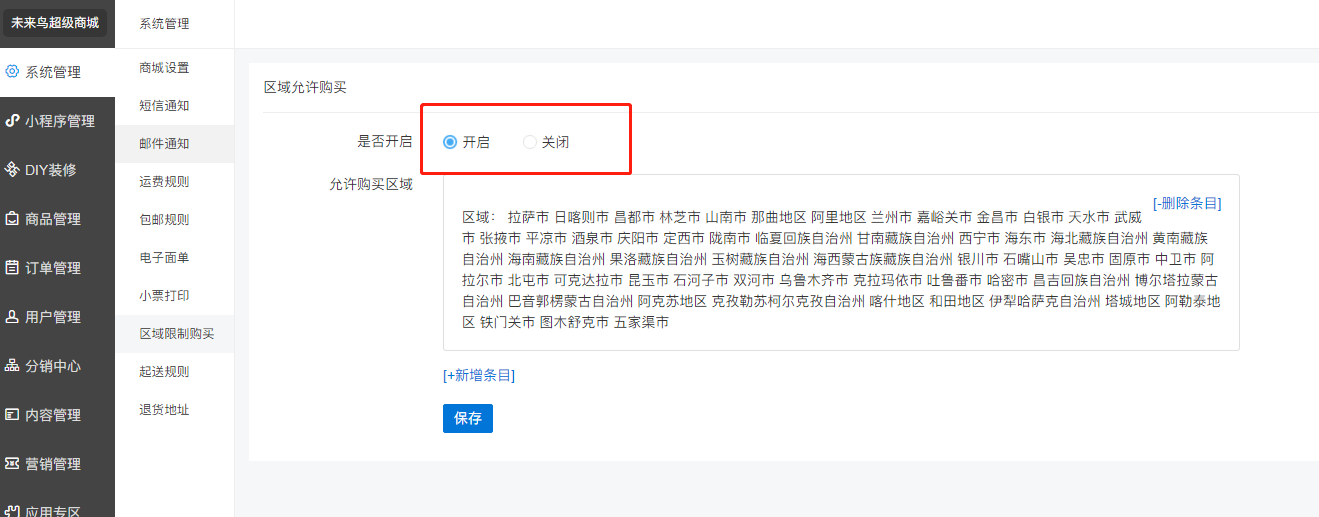 ### 区域限制购买 #### 请看配置的位置:  ### 说明: - 勾上的区域可以购买,没有勾上的区域不能下单 - 支持开启关闭