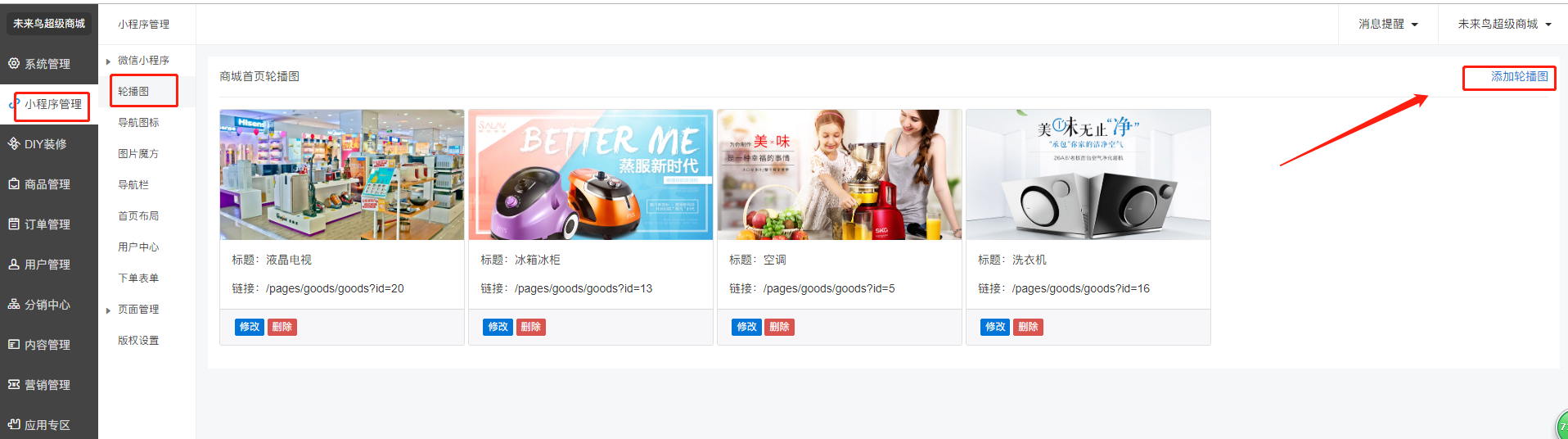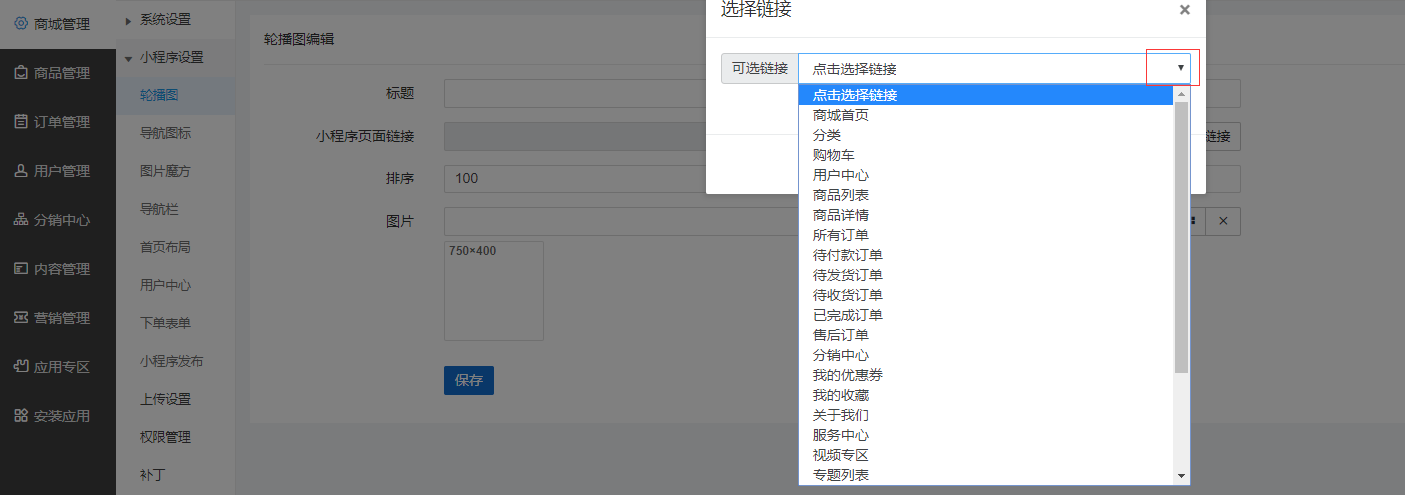 ### 轮播图 #### 请看配置的位置:  #### 小程序页面链接作用 答:用于点击跳转页面  #### 流程:  #### 支持的跳转链接