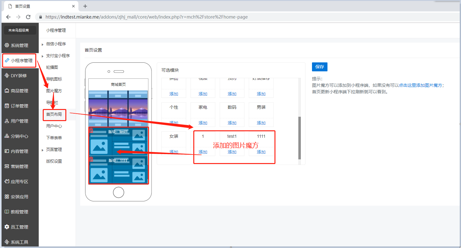 ### 图片魔方 #### 请看配置的位置:  #### 说明: - 点击添加:可以添加板块图片 - 支持三种样式 #### 使用: ##### 首页布局:  ##### diy布局:  ##### 效果图: