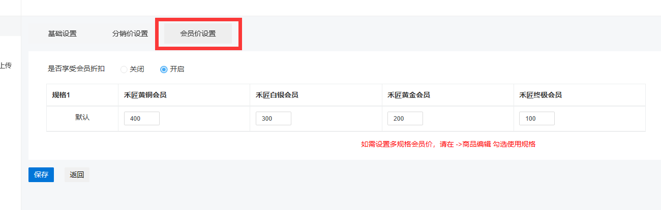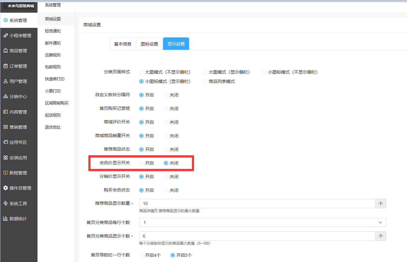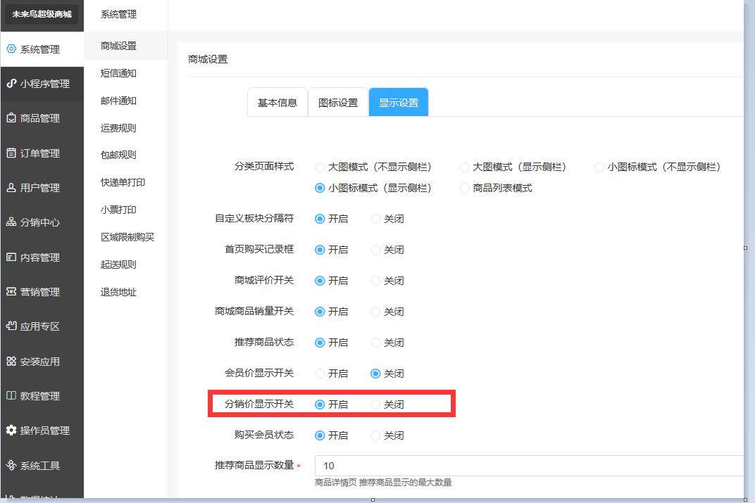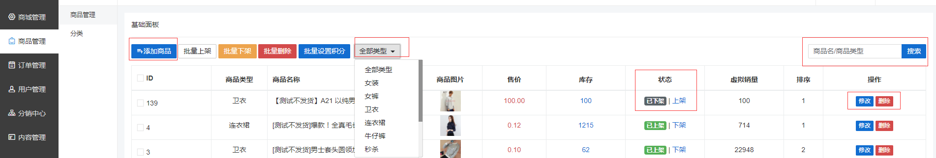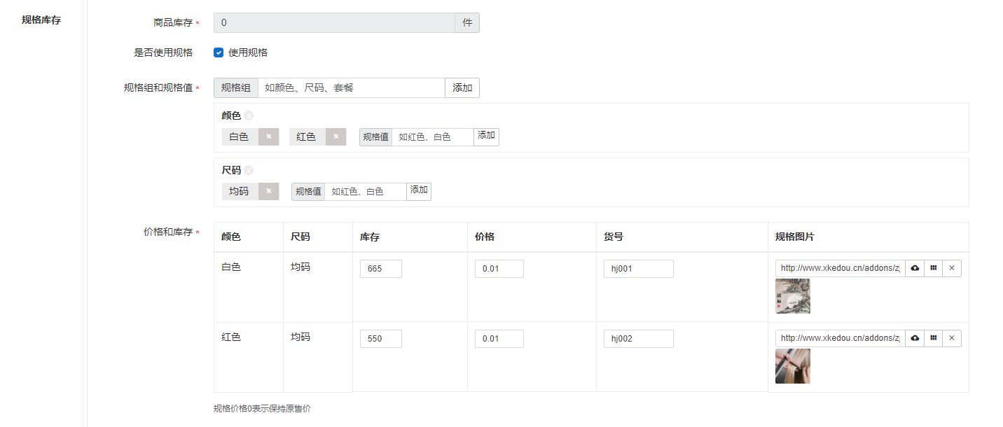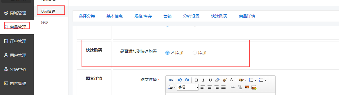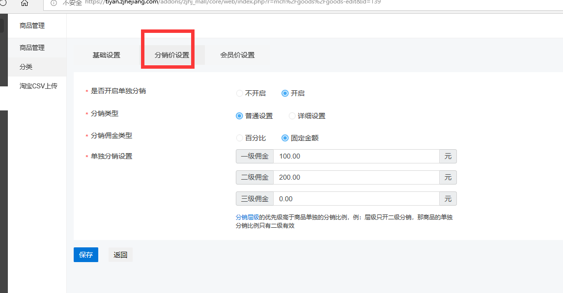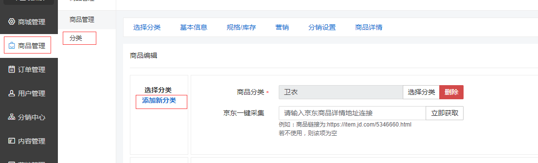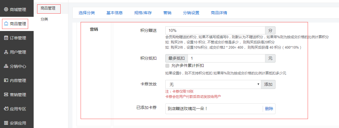 ### 商品编辑 #### 请看配置的位置:  #### 商品列表说明: - 支持商品名和商品类型搜索 - 支持分类类型刷选 - 支持批量上下架,单个商品上下架 - 支持批量删除 - 支持批量设置积分 - 支持批量设置积分 - 支持商品小程序码下载 #### - 商品编辑说明: ##### 1、 选择分类  - 支持一级,二级分类 - 支持多分类 - 支持京东一键采集 ##### 2、基本信息 https://box.kancloud.cn/81a6f5351b3a8be5f5c7ce2017fe54a2_772x784.png - 带红色*标记的都是必填 - 商品单位可自定义 - 商品排序数字越小,越排在前面 - 商品视频支持:腾讯视频(点击分享可以复制链接的),源地址(直接能下载的),本地视频 - 商品图片支持选择历史图片  - 支持运费设置,运费模板配置位置:商城管理=》系统设置=》运费规则  - 支持单品满件包邮和单品满额包邮,同时设置的话,哪个条件先满足就按照那个规则  #### 3、规格库存  - 支持规格启用关闭 - 支持自定义规格 - 支持多规格组合 - 规格说明: 规格组,如:颜色,尺寸 规格值,如:规格组颜色(红色,蓝色....),规格组尺寸(L,XL,M) #### 4、营销  - 积分 1、配置积分比例  2、积分赠送 会员购物赠送的积分, 如果不填写或填写0,则默认为不赠送积分,如果带%则为按成交价格的比例计算积分 如: 购买2件,设置10 积分, 不管成交价格是多少, 则购买后获得20积分 如: 购买2件,设置10%积分, 成交价格2 * 200= 400, 则购买后获得 40 积分(400*10%) 3、积分抵扣 允许多件累计折扣: 开启:如设置抵扣10元,购买2件,那就是2*10 关闭:如设置抵扣10元,购买2件,那就是10 如果设置0,则不支持积分抵扣 如果带%则为按成交价格的比例计算抵扣多少元 - 卡券  注意:卡券仅限10张,卡券会在用户付款后自动发放给用户 卡券设置教程位置:营销管理=》卡券 #### 5、分销设置  - 支持单品分销开启和关闭,开启单品分销后,以单品分销为准,全局分销配置教程位置:分销中心 - 支持分销佣金类型:百分比和固定金额 - 注意:分销层级的优先级高于商品单独的分销比例,例:层级只开二级分销,那商品的单独分销比例只有二级有效 - 分销 分销价支持在商品详情中显示 ,设置开关  #### 6.会员设置  *支持单商品设置会员价,不同的规格设置不同的会员价,需要在系统管理-商城设置中设置  #### 7、快速购买  #### 8、图文详情