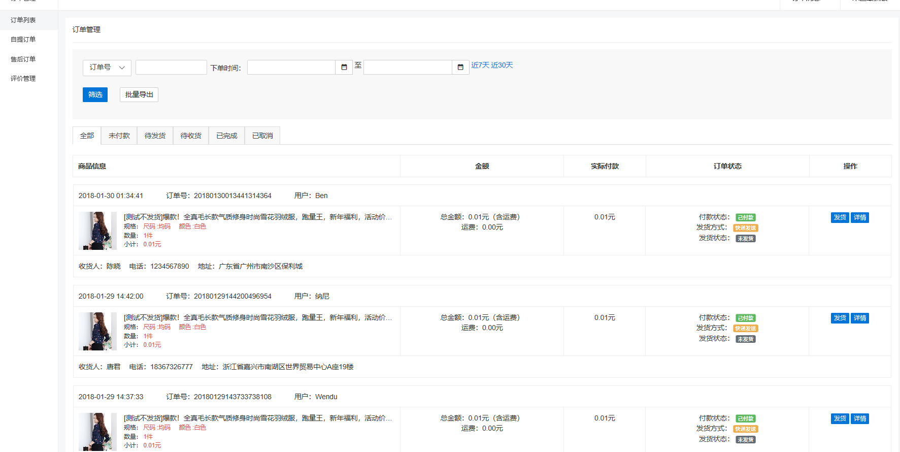 ### 订单列表 #### 订单列表 #### 1.订单基本信息 购买时候选择了快递方式的订单在该页面中展示(具体在商城管理-商城设置中)   筛选条件:能够使用进行模糊搜索订单  #### 注:全部不包含已取消订单, 首页显示的订单数就是全部里面的订单数 #### 2.订单操作基本信息  1.未付款订单:能够修改价格,未付款订单超时将自动取消,时间设置在商城管理-商城设置中; 2。待发货订单:待发货是已付款的订单,支持发货功能,发货可以填写快递跟物流单号(商城管理-商城设置-快递鸟),也可以使用电子面单功能(商城管理-;快递单打印),也可以无需物流,并填写商家留言,用户可在小程序端看到 注:电子面单请咨询当地快递公司或者快递公司总部,其中邮政的电子面单必须用到邮政编码,其他快递邮编可不填  用户若已付款未发货可申请取消,需要管理员审核,审核通过金额原路返回  3.待收货订单:用户在小程序段可点击收货,若用户长时间没有收货,系统会根据商城管理-商城设置中的自动收货时间自动收货,收货之后,若该订单没有超过系统规定的售后时间(商城管理-商城设置中的售后时间),用户也可以申请退货,订单进入售后订单处理; 4.已完成:订单超过售后时间且无取消退货,则为已完成订单 5.已取消:未付款自动取消或者已付款未发货取消的订单列表