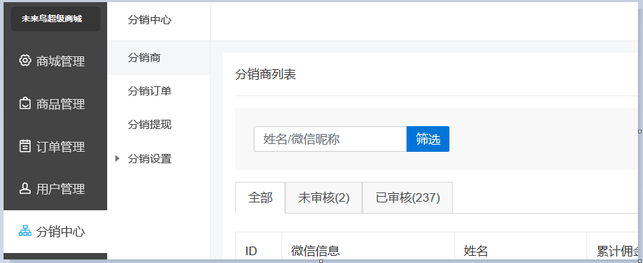 ### 分销商管理 #### 分销商管理 #### 1.进入分销商管理: 设置好小程序,用户在小程序端申请成为分销商或者已经成为分销商之后,所有分销商在该页面进行管理  #### 2.审核分销商: 点击筛选出等待审核的分销商,点击操作-审核通过/或者不通过,若不通过,该用户下次能继续申请成为分销商 #### 3.分销商操作: 审核通过成为分销商之后,后台可查看会员订单,分销商信息,订单,下级成员以及成员的订单,并且可以删除分销商:  会员订单:点击会员订单跳转到订单页面,显示该分销商下单的订单信息 分销订单:点击分销订单显示该分销商所属下一级所有的订单信息 提现明细:点击提现明细,可查看该分销商所有申请提现记录 删除分销商:点击删除分销商,该功能是删除分销商资格以及删除该分销商上下级分销关系;注:只删除关系,不删除之前的分销业务数据跟佣金数据,若下次该分销商再次成为平台分销商,则之前佣金数据跟订单数据仍然存在,但是成员信息不在; 查看下级:可在列表页直接点击插件下级成员