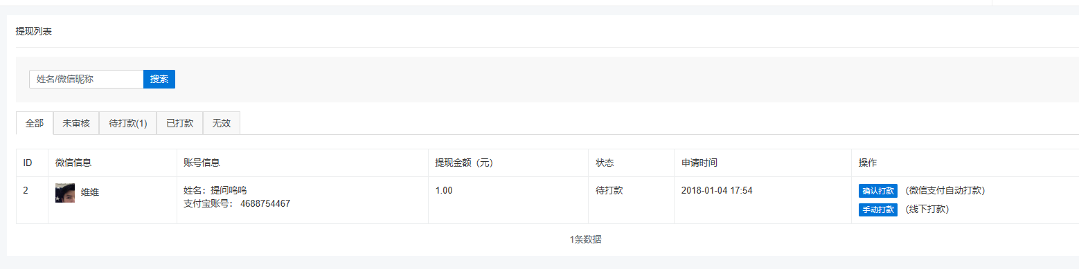 ### 提现管理 #### 提现管理 #### 1.进入提现管理: 当分销商的佣金达到一定程度,可申请提现(注:可提现佣金必须是订单已完成-收货并且已过售后时间)  #### 2提现打款: 打款分为自动跟手动,1.自动,需开通企业付款到零钱功能 注:在商户号产品中心开通,出现条件是商户号注册>90天,连续一个月有交易,若不满足,则不在产品中心出现 2.手动,在第二步基础设置中设置选项,根据分销商填写的微信账号/支付宝账号/银行卡号 线下打款,直接点击手动打款完成。