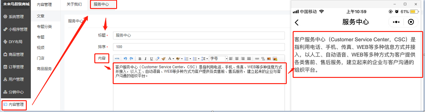 ### 文章管理 ### 文章管理 文章管理主要用于前端个人中心-服务中心&关于我们 注:可在商城管理-小程序设置-用户中心自行选择开启关闭 #### 1.关于我们: 可在自定义富文本框中编辑内容,在前端展示平台信息; #### 效果图:  #### 2.服务中心: 服务中心可添加多条信息,自己设置排序(默认排序100 越小越前),服务中心一般用于平台帮助说明文档 #### 效果图: