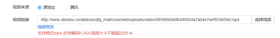 ### 视频管理 #### 视频管理 视频模块功能是用于视频专区&专题中的视频,可在商城设置-小程序设置-首页/轮播图/魔方板块/导航图标中添加 ##### 1.添加视频: ##### 视频支持2种形: 1-源地址,源地址表示用户本地上传的视频或者是上传到其他平台的视频,以.mp4结尾,看在浏览器打开下载的那种 ##### 注:支持格式mp4;支持编码H.264;视频大小不能超过50 M 若发现视频上传不了 已查看本地服务器php配置支持的上传大小,若 视频上传观看不了,请检查编码格式转码 可以百度搜索格式工厂,下载工具转码 2.腾讯视频,可以选择腾讯视频,去腾讯视频复制链接,直接填入即可 ##### 注:不支持电视剧,电影等长篇视频  #### 2.前端展示: