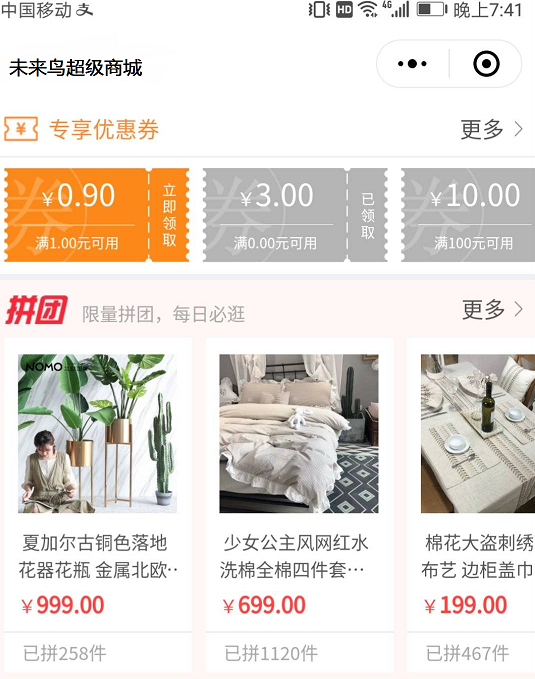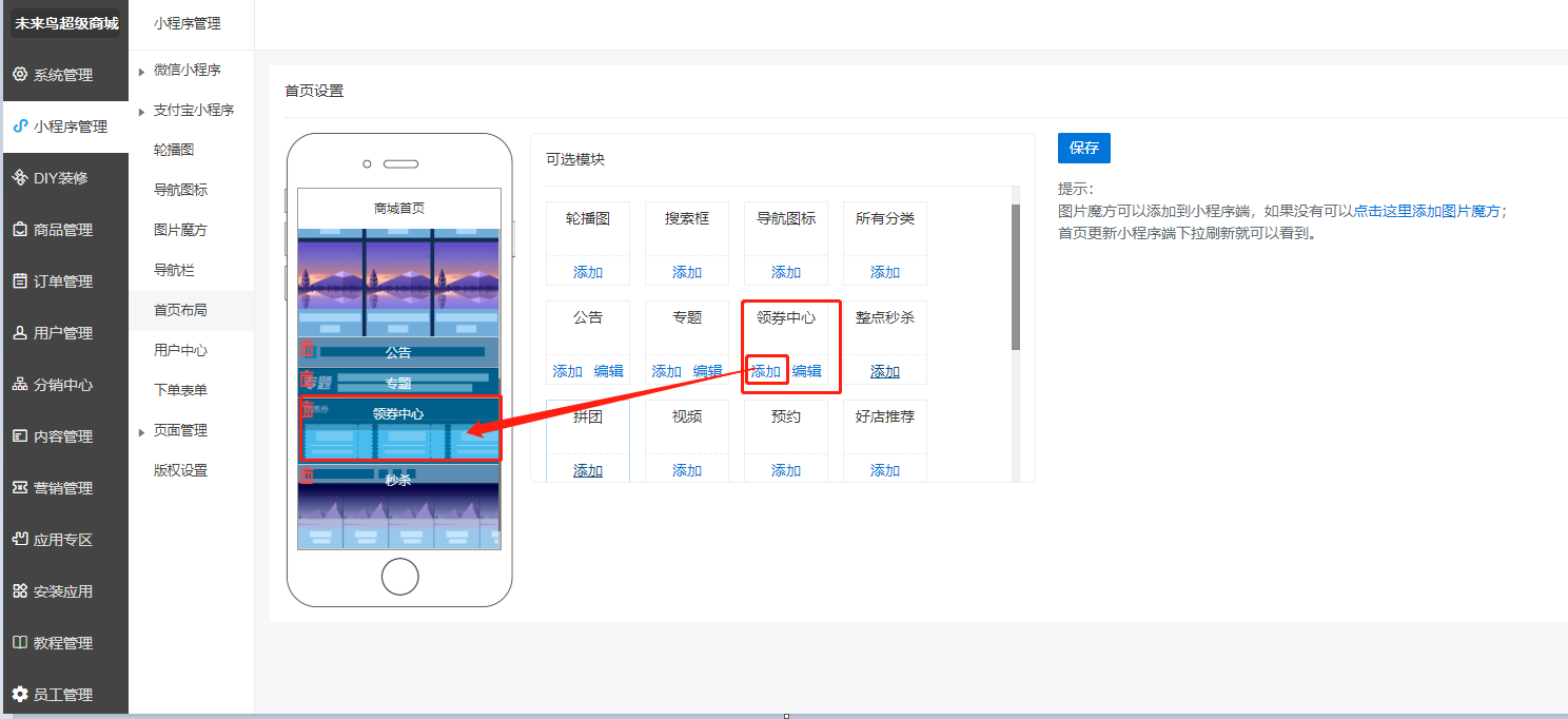 ### 优惠券 #### 第一步: 点击:添加优惠券  注:优惠券只能抵消商品金额,不能抵消运费,商品金额最多优惠到0.01元  1.可指定商品类别使用  2.可指定商品使用  3.不添加表示全场通用  #### 第二步:添加自动发放方案 选择触发事件和发放的优惠券  小程序端显示如下:  若,小程序端没有显示 是因为没有到“商城管理”—>“小程序设置”—>“首页布局” —>“添加领券中心”