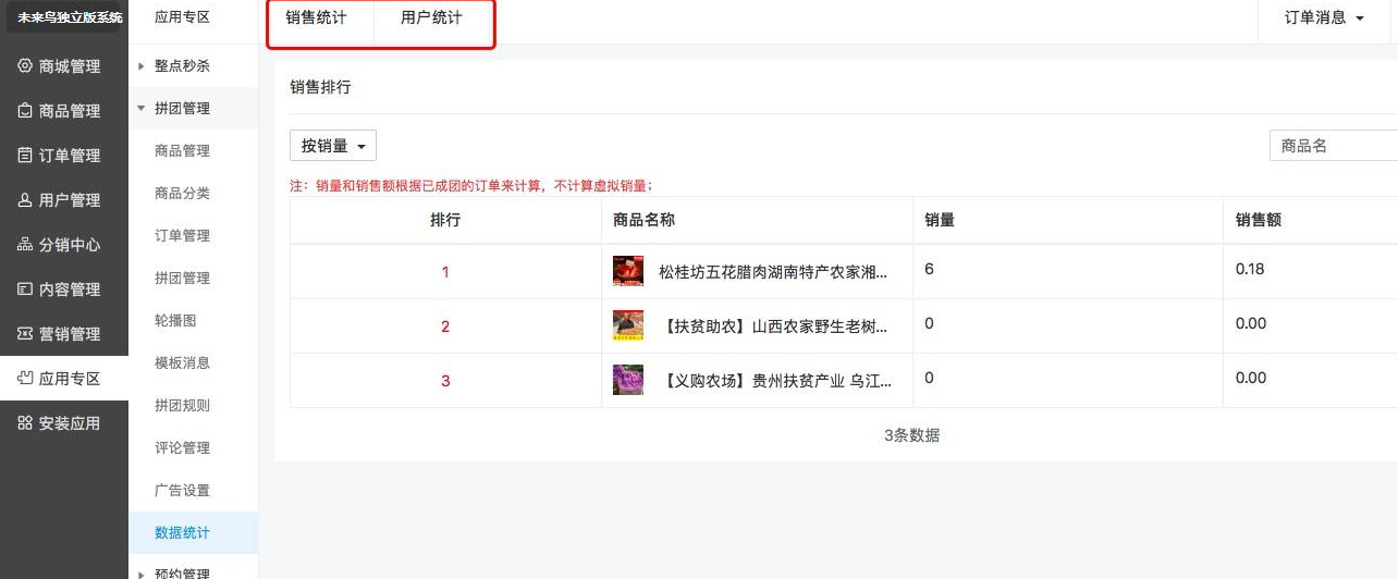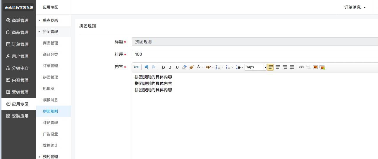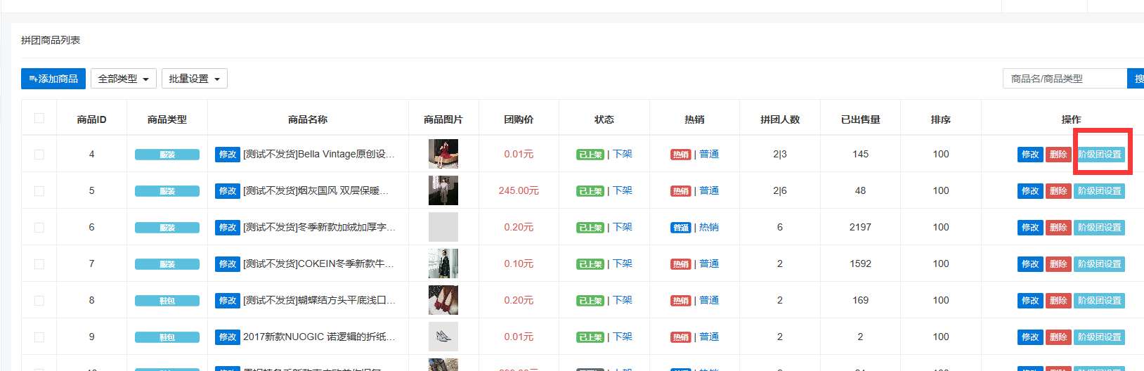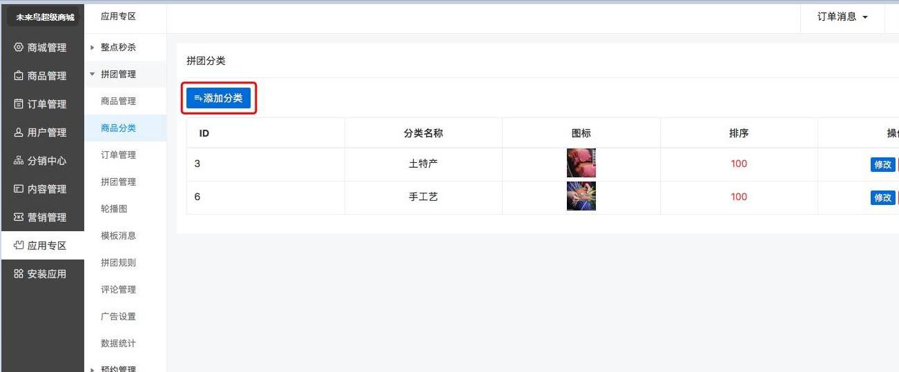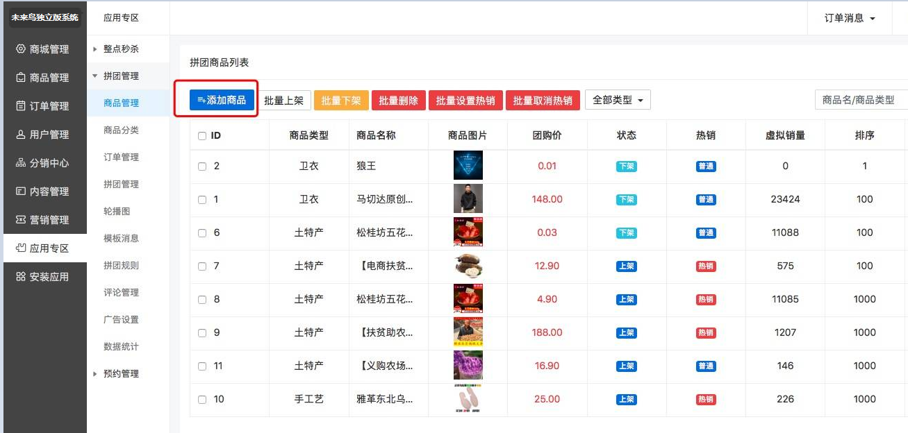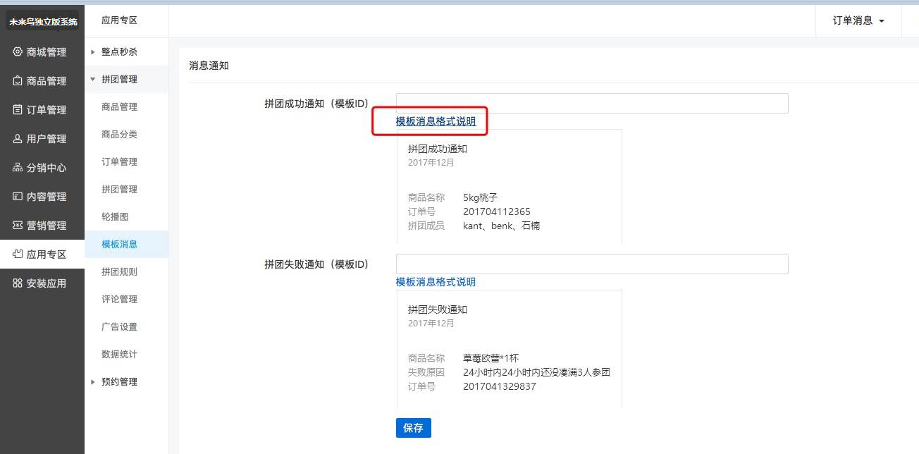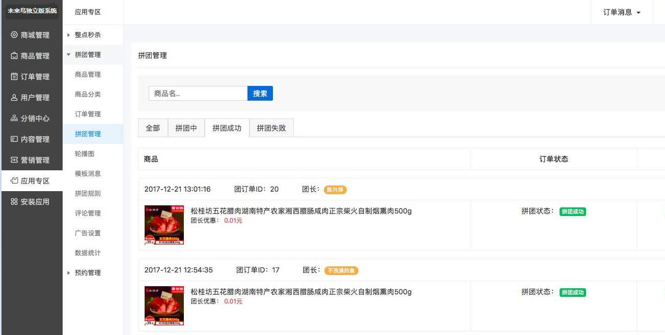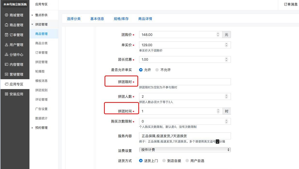 ### 拼团管理 #### 第一步:添加分类   #### 第二步:添加商品   商品ID在商品管理(商品列表)里查看,如下:   商品中可单独添加分销佣金跟会员价  同时支持阶梯团设置: 可以设置不同的开团人数跟对应的价格,分销佣金跟会员价也单独设置  说明: 拼团限时是指:此拼团商品上线后多久时间自动下架 拼团时间:团长开团后多长时间拼团失败 运费设置:到“商城管理”去设置   #### 第三步:拼团订单管理 订单状态分为:未付款、待发货、已发货、拼团中、已完成、已取消  #### 第四步:拼团管理 拼团状态分为:拼团中、拼团成功、拼团失败  #### 第五步:拼团轮播图   #### 第六步:模版消息  #### 第七步:拼团规则  #### 第八步:评论管理  #### 第九步:广告设置  #### 第十步:销售统计