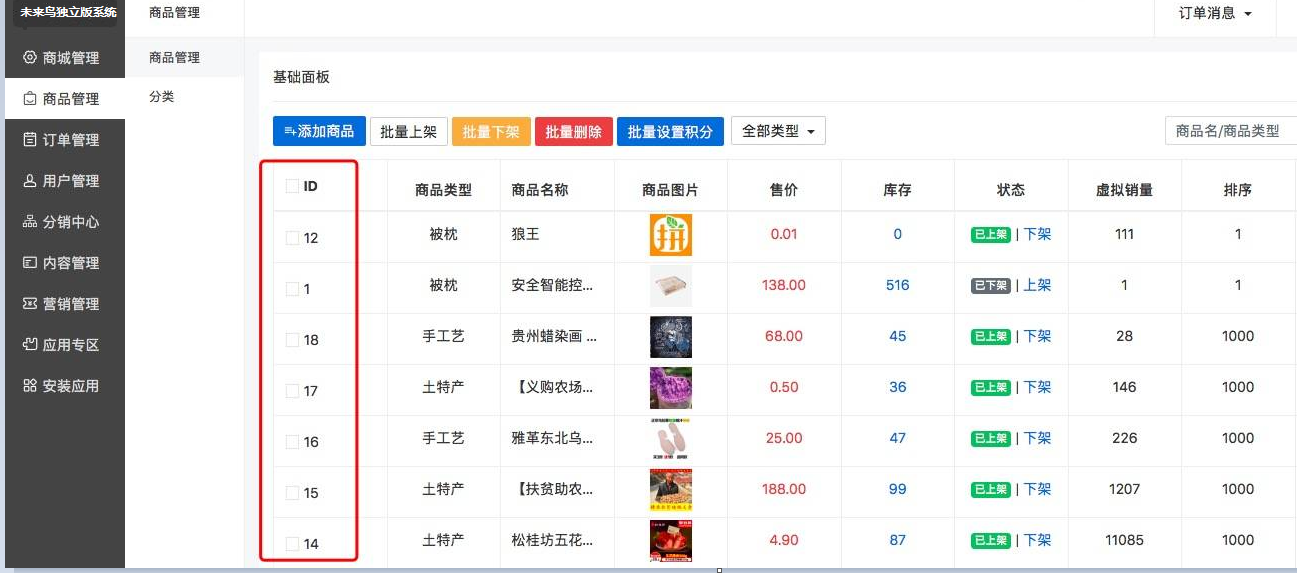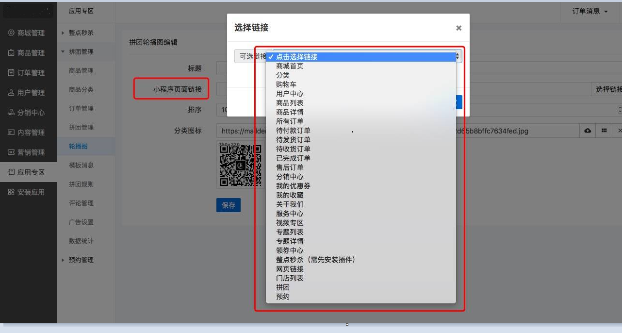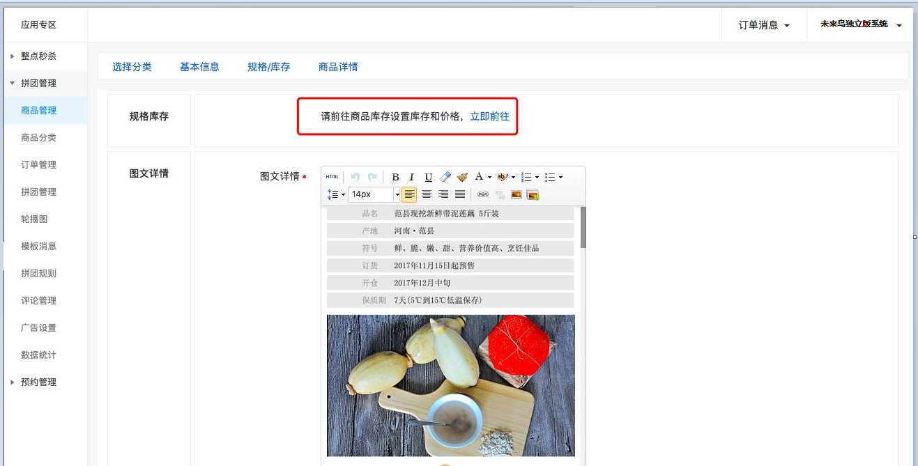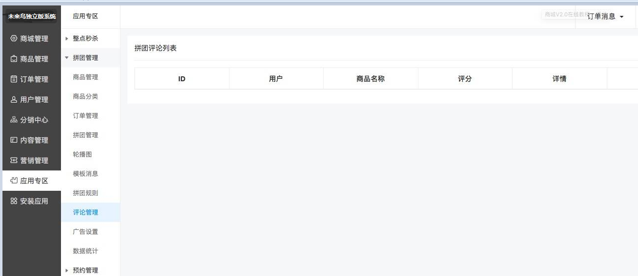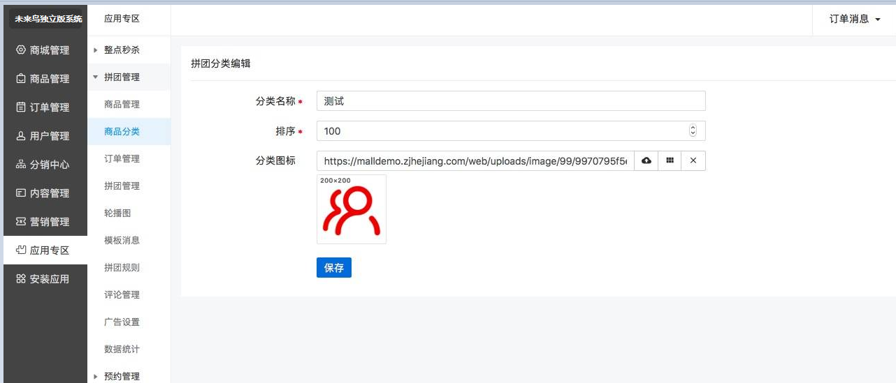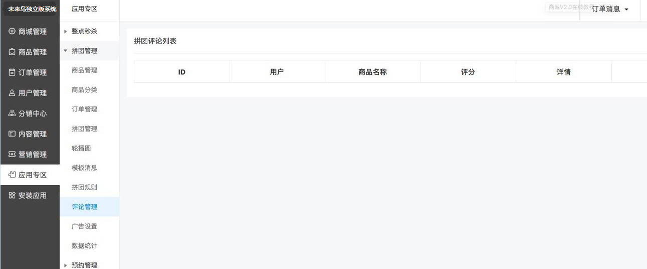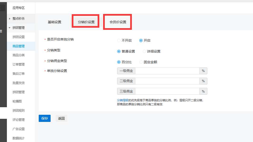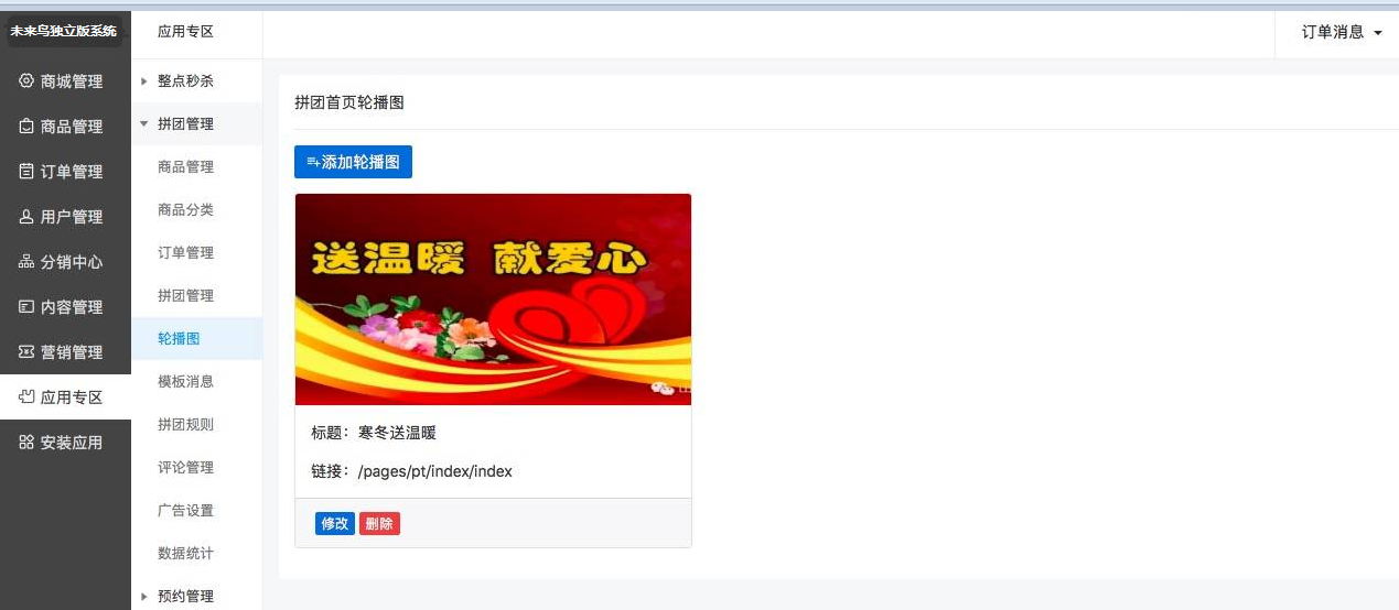 ### 拼团管理 #### 第一步:添加分类   #### 第二步:添加商品   商品ID在商品管理(商品列表)里查看,如下:   商品中可单独添加分销佣金跟会员价  同时支持阶梯团设置: 可以设置不同的开团人数跟对应的价格,分销佣金跟会员价也单独设置  说明: 拼团限时是指:此拼团商品上线后多久时间自动下架 拼团时间:团长开团后多长时间拼团失败 运费设置:到“商城管理”去设置   #### 第三步:拼团订单管理 订单状态分为:未付款、待发货、已发货、拼团中、已完成、已取消  #### 第四步:拼团管理 拼团状态分为:拼团中、拼团成功、拼团失败  #### 第五步:拼团轮播图   #### 第六步:模版消息  #### 第七步:拼团规则  #### 第八步:评论管理  #### 第九步:广告设置  #### 第十步:销售统计