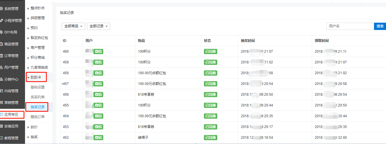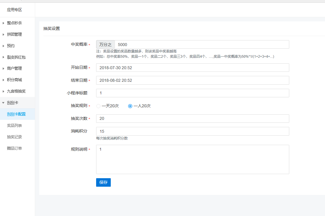 ### 刮刮卡 #### 第一:刮刮卡设置  设置中奖几率:万分之xx 注意:该中奖几率是指每次抽奖的中奖几率,先判断该次抽奖是否中奖,在中奖的情况下,从有库存的奖品中随机抽取,库存越大,几率越高。 抽奖规则设置: 一天N次 指每个人每天的抽奖次数; 一人N次 指每个人该次活动时间内一共能抽奖次数 消耗积分:每次抽奖需要消耗积分,不填或者填0不消耗积分 #### 第二:奖品设置 点击奖品设置到奖品设置页面   奖品可设置 余额红包(余额),优惠券,积分,赠品(商城商品) 可设置库存,抽中既减少库存,注意:商品中奖之后发货是根据该商品管理中的库存去判断,诺该商品没有库存,会提示无法兑换 设置好商品之后,使用导航图标/魔方/轮播图设置连接 必须要2.6.6之后的版本重新上传审核通过才能使用 #### 第三:抽奖记录 用户抽奖记录列表  #### 第三:赠品订单 所有用户中商品之后兑换发起的订单列表