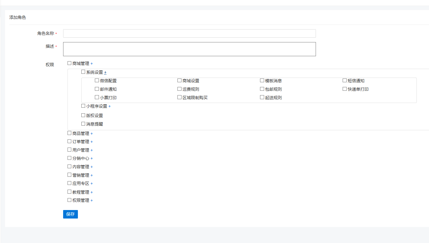 ### 角色管理 角色管理用于操作员权限角色管理 主要功能为下面的用户管理中的用户提供可选角色权限组 添加角色:添加角色名称,描述,勾选该角色的权限目录