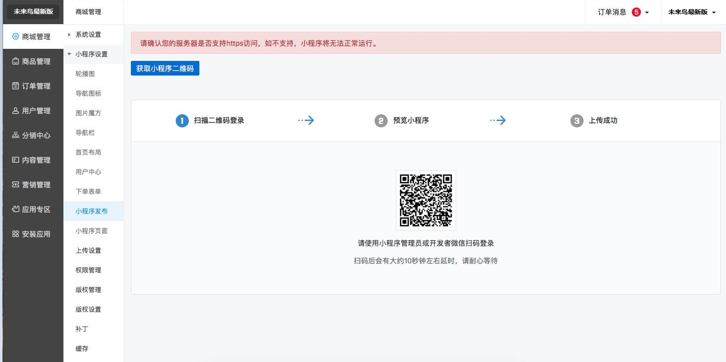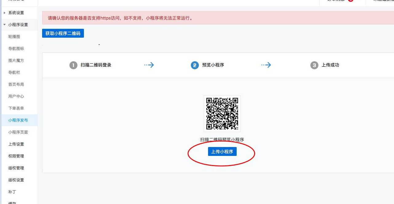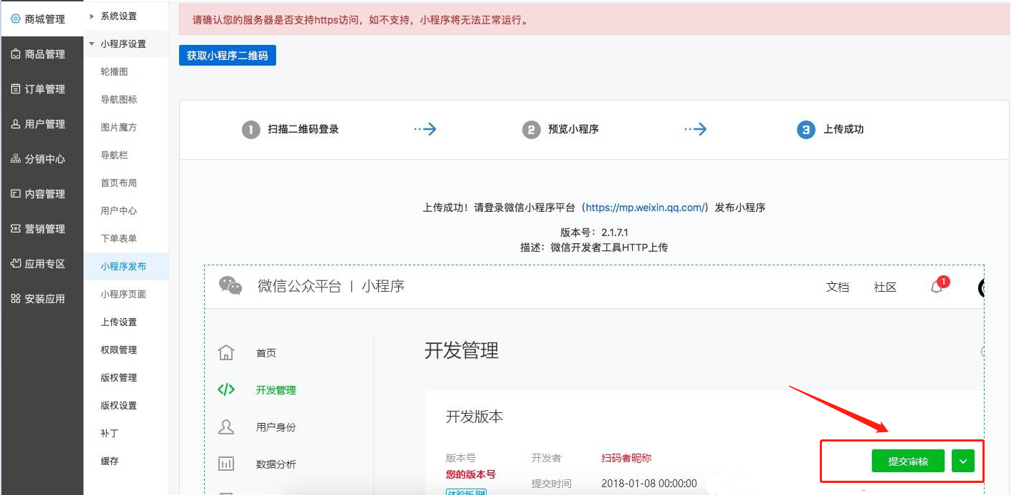 ### 小程序发布教程 #### 第一步:进入电商云后台 “商城管理”—“小程序设置”—“小程序发布” 用微信小程序管理员或者授权的开发者微信扫一扫  然后上传小程序到腾讯微信小程序后台  上传成功后,到腾讯微信小程序后台( mp.weixin.qq.com )发布审核