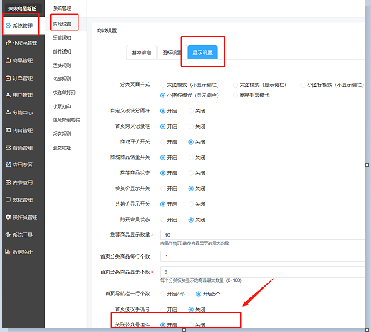 ### 关注公众号组件 #### 1.进入微信公众平台-小程序后台设置  #### 2.进入商城后台开启  #### 3.扫商品海报触发 ##### 注意:必须扫码 不能识别二维码 小程序前端也必须是2.9.26之后的版本