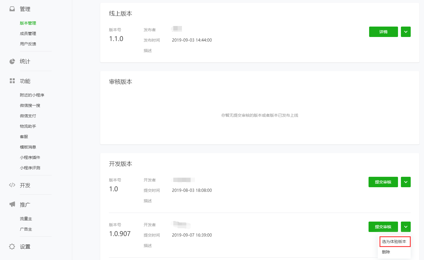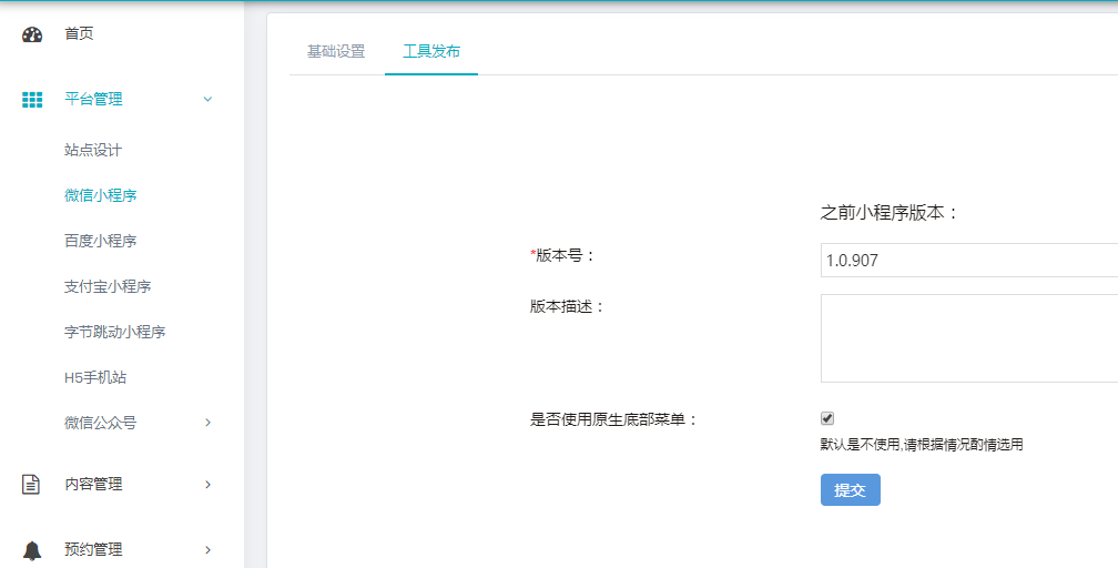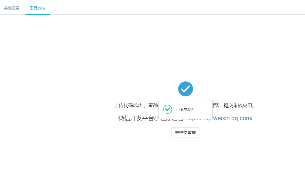微信小程序上传及提交审核 提示:上传小程序前需要确认 1、微信小程序公众平台的服务器域名已添加 2、上传小程序的站点域名和公众平台的服务器域名须一致 3、须使用https 一、打开微信小程序的“工具发布”页面,填写版本号,设置是否使用原生底部菜单,提交小程序上传  二、使用小程序管理员或开发者微信扫码,确认登录微信开发工具,即可上传  三、大约2-3秒钟后,即可出现上传成功提示  四、登录微信小程序公众平台,找到刚上传的小程序版本,设为体验版,用小程序管理员或开发者微信扫码预览,如果没有问题即可提交微信官方审核。