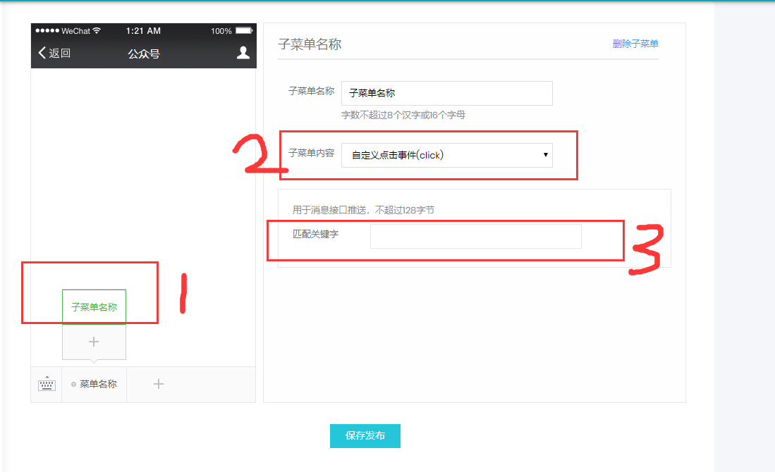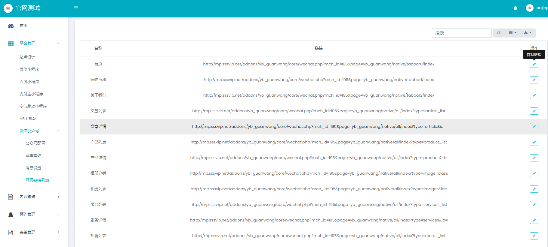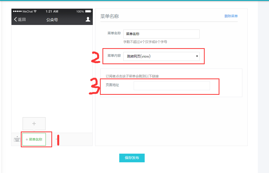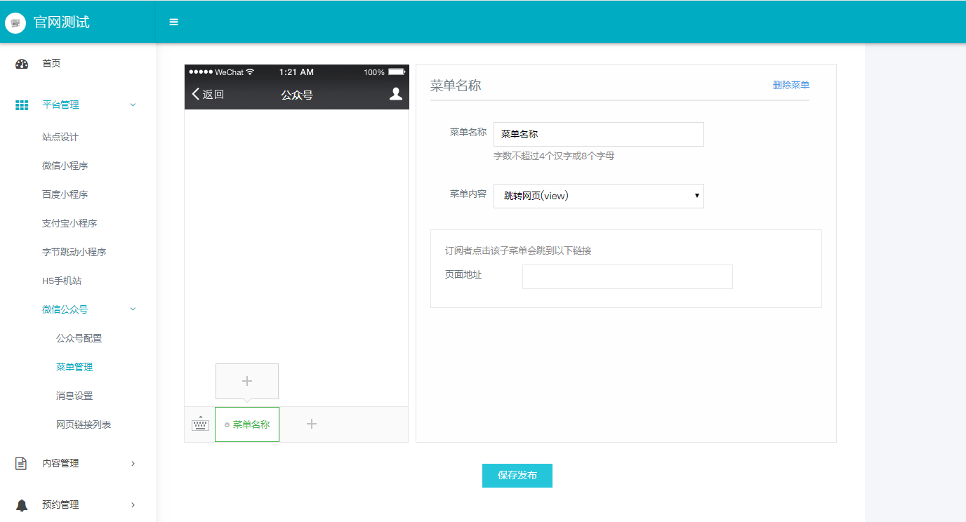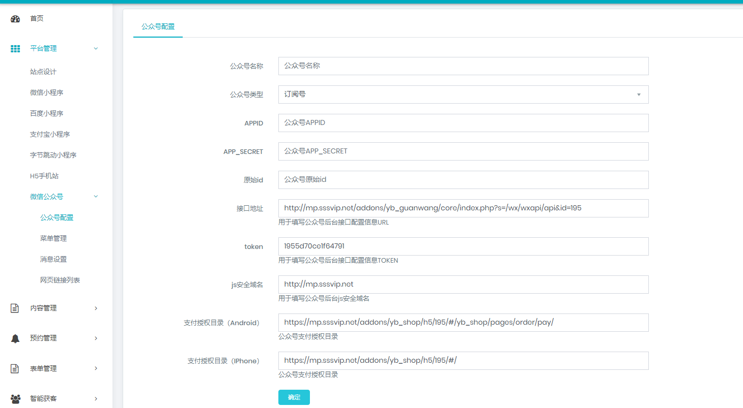 # 2.7.1、公众号配置  数据获取可参考一、壹佰智慧轻站操作手册的微信公众号相关 ### 2.7.2、菜单管理    可通过自己需求添加菜单以及子菜单,添加后右侧右侧为属性,可以设置标题,链接、删除此菜单等。 ### 2.7.3、消息设置  消息设置 增加的关键字 可以在菜单中使用 对应菜单填写关键字 当手机上点击这个菜单时 就会触发这个关键字设置的内容  菜单管理具体操作流程 ### 2.7.4、网页链接列表  链接可在菜单管理里面进行使用 具体步骤如下  将链接复制下来粘贴到第三个框页面地址文本框中
