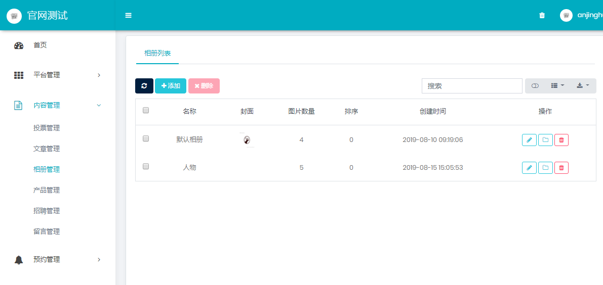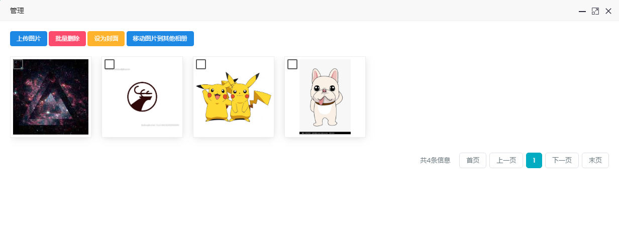 3.2、相册管理  相册管理 可以创建、编辑、管理、删除相册,相册的主要作用在于方便商品图片的管理。 相册列表可查看已创建的相册名称、封面、图片数量、添加时间等,还可对相册进行改名、删除等操作。  点击管理可以在在此相册上传图片,批量删除,设置封面,移动图片到其它相册等功能。