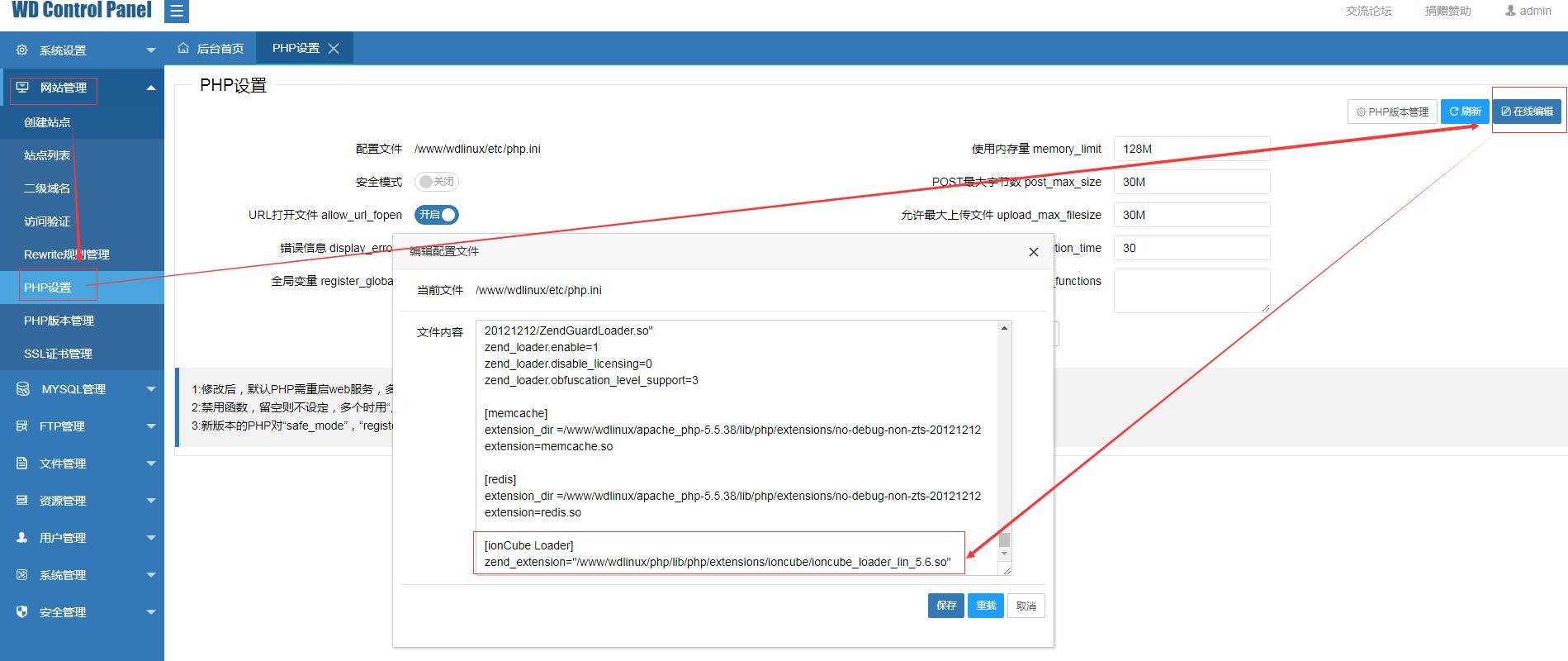 #### 一、根据你的linux系统位数32/64BIT版本,下载ioncube,然后移动到extensions目录下,找到对应的目录文件。 ##### A – 32位系统 wget http://downloads3.ioncube.com/loader_downloads/ioncube_loaders_lin_x86.tar.gz tar -zxvf ioncube_loaders_lin_x86.tar.gz mv ioncube /www/wdlinux/php/lib/php/extensions ##### B – 64位系统 wget http://downloads3.ioncube.com/loader_downloads/ioncube_loaders_lin_x86-64.tar.gz tar -zxvf ioncube_loaders_lin_x86-64.tar.gz mv ioncube /www/wdlinux/php/lib/php/extensions #### 二、设置软件路径 在WDCP中找到php.ini文件,然后将放在最下面保存,在重启下服务器。 [ionCube Loader] zend_extension=”/www/wdlinux/php/lib/php/extensions/ioncube/ioncube_loader_lin_5.6.so”