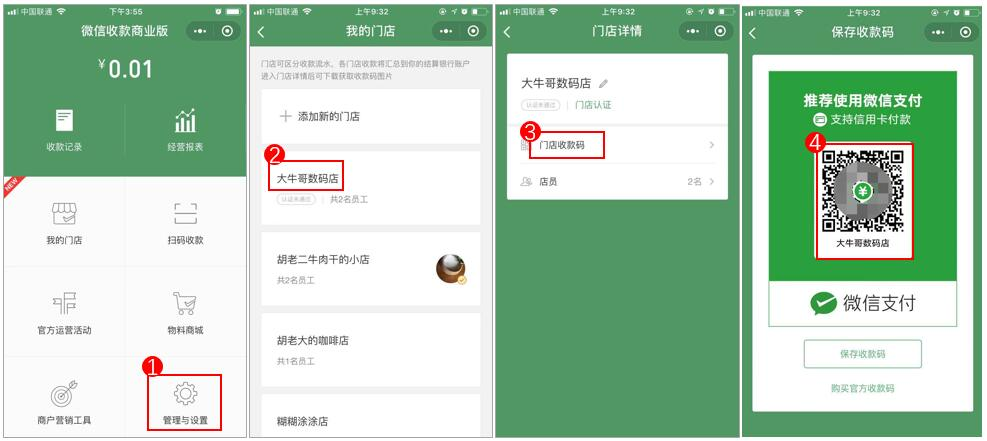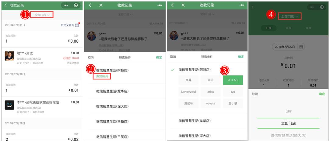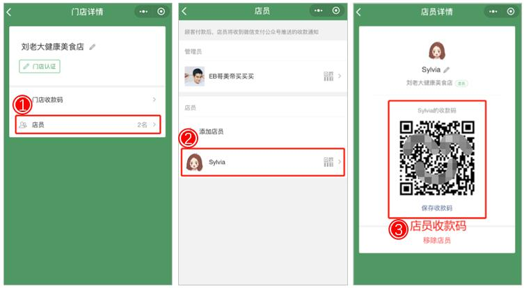 一、门店收款码 1、门店收款码介绍 门店收款码是每个商户生成门店时,同时生成的门店收款二维码(开通买单默认开启一个门店),通过门店收款码收到的资金会进入商户结算银行账户(开通微信收款商业版时绑定的银行账户)。 2、门店收款码功能 目前一个商户支持创建200个门店,门店可添加50名店员,每个门店有各自不同的门店收款码。管理员和店员可在微信收款商业版小程序->【我的门店】中查看“门店收款码”(操作如下图),使用门店收款码成功收款后,对应门店的店员会收到“收款通知”及“语音播报”,管理员可收到所有门店的通知。  温馨提示: 该收款码可直接对外进行扫码收款操作,管理员可查看所有门店的收款码,店员可查看自己所在门店的收款码。 二、店员收款码 1、店员收款码介绍 店员收款码是每个商户在相应门店里配置的店员,每个店员可开启店员收款码,店员收款码所收款项金额数据将纳入该店员所在门店数据统计, 通过店员收款码收到的资金会进入商户结算银行账户(开通微信收款商业版时绑定的银行账户)。 2、店员收款码功能 目前一个门店支持绑定50个店员,每个店员有自己的店员收款码。管理员也可通过【我的门店】->选择门店->点击【店员】->看到所有店员的“店员二维码”(操作如下图),店员只可查看自己所在门店的“门店二维码”及自己的“店员二维码”,进入步骤相同。  在【收款记录】及【经营报表】中可按门店维度来查看收款详情,同时【收款记录】还可按某门店中店员维度来查看收款详情,如下图所示。  店员收款码适用的场景与权限说明 1)开启店员收款码后,店员收款码成功收款后,仅管理员和该码对应的店员可接收收款通知(管理员可查看所有门店店员的收款记录;店员仅可查看对应门店下所有店员的收款记录) 2)当商户需要区分店员交易收款时,建议可使用店员收款码,如:客运公司需区分、统计每辆客车的售票情况;超市需区分、统计每个通道不同收银员的收款情况;商户有区分、统计每个业务员的业绩,以便奖励等