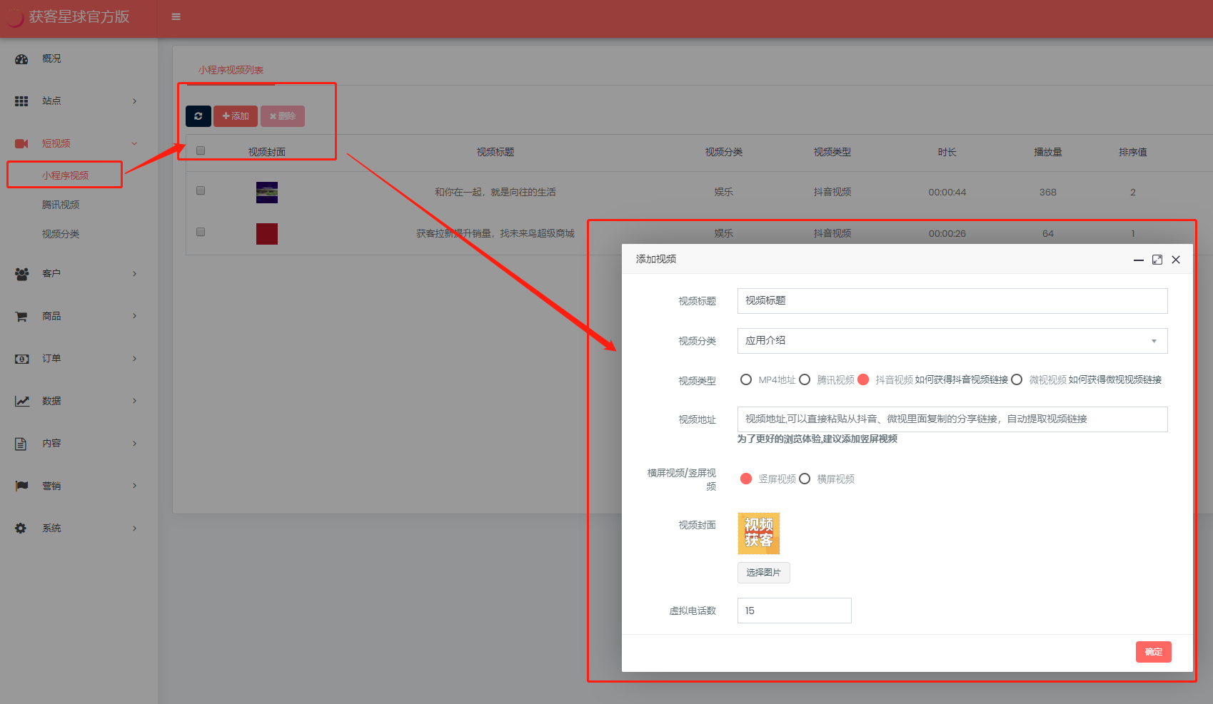#### 添加视频 **小程序视频——添加——填写上传视频信息——填写视频地址链接——确定保存** 1、可添加视频类型:MP4地址(服务器上直接上传视频)、抖音视频(抖音上的视频,分享复制地址即可添加)、微视视频(微视上的视频,分享复制地址即可添加) 2、虚拟数值:自定义视频的播放量等,吸引客户点击 3、添加商品:所添加商品会显示在视频页下方,点击商品即可了解购买 4、视频封面:不上传封面,在小程序端封面是显示灰色,建议添加视频封面