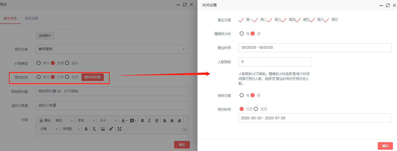 #### 一、添加预约分类 预约分类——填写信息——确定保存  #### 二、添加预约商品 1、预约列表——添加——填写预约信息——确定保存 2、预约时间:打开预约时间,可设置预约的时间限制   #### 三、订单管理 可查看所以预约订单详情 #### 四、订单设置 设置预约时,所需要填写的信息:添加预约项——填写预约需填写的信息——确定保存  #### 一、进入站点装修页面 #### 二、选择需要展示“预约功能”的页面(商城页为例) #### 三、添加一个预约列表组件——数据——手动选择——选择展示的预约商品——确定保存即可