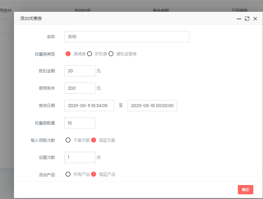 #### 一、添加优惠券 添加优惠券——填写优惠券信息——选择优惠券类型及时间等——确定保存即可(发放状态需开启才可以)  #### 二、使用优惠券 **1、新客有礼:新用户进入小程序时,弹出优惠券 ** 2、添加方式:新客有礼——添加——填写活动信息(时间与设置优惠券时间一致)——勾选优惠券——确定保存 **3、支付有礼:用户支付后弹出优惠券(添加方式相同)** **4、小程序页面显示优惠券:站点设计里,添加优惠券组件,添加优惠券即可**