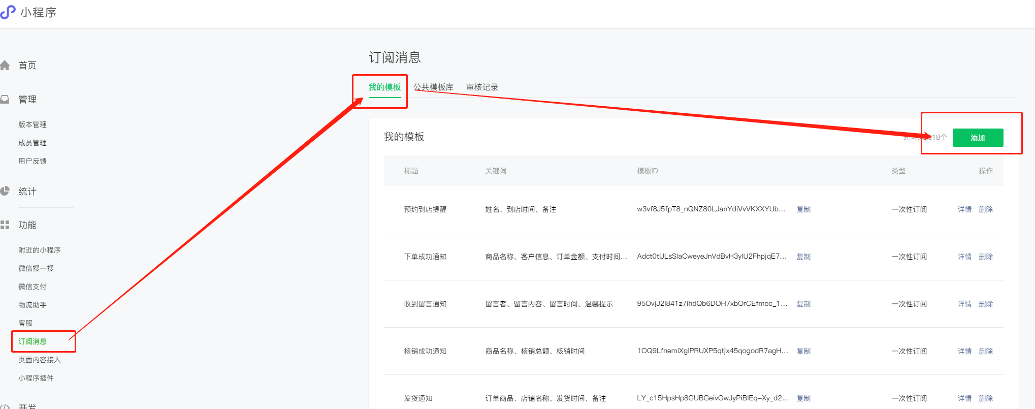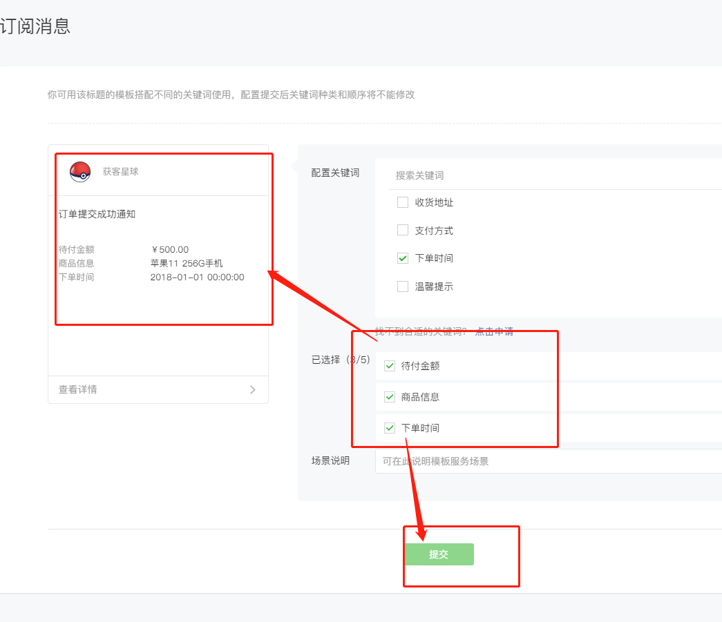 ## 小程序订阅消息配置 模板消息配置方法类似,本文以【订单提交成功通知】订阅消息为例  一、登录微信小程序公众平台mp.weixin.qq.com,添加小程序类目【生活服务-线下超市/便利店】,如有添加可直接进行下一步。  二、在微信小程序公众平台,打开【功能】-【订阅消息】-【添加】  三、搜索【订单提交成功通知】,在搜索结果中定位到服务类目为【生活服务-线下超市/便利店】的订阅消息,然后【选用】  四、根据【获客星球】后台提示的关键词,先复制【温馨提示】   五、在公众平台【配置关键词】中搜索【温馨提示】,然后勾选 然后搜索第二个关键词【待付金额】,然后勾选 接下来搜索【商品信息】,然后勾选 最后搜索【下单时间】,然后勾选  六、填写场景说明,点击【提交】  七、将生成的模板ID复制到门店后台,同时点击【开启】按钮并【保存】   八、其他的订阅消息亦同理。