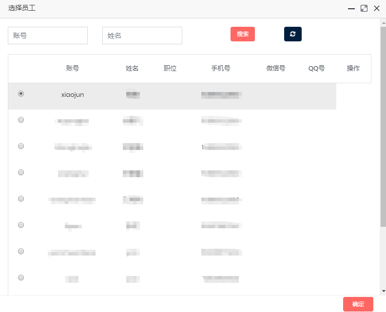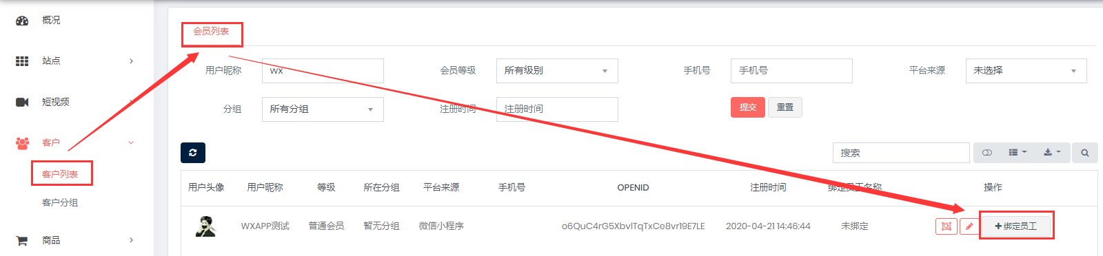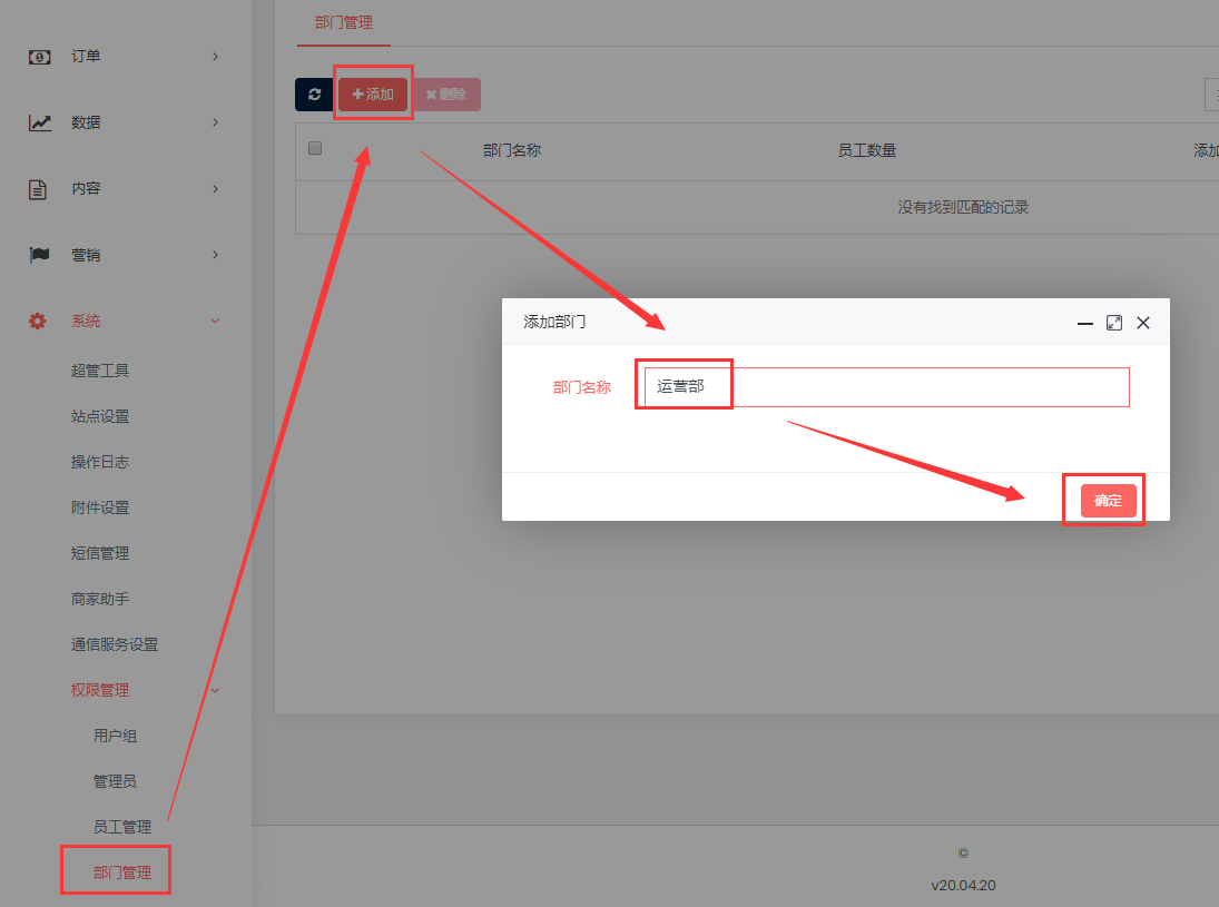 ## 添加账号及绑定员工 一、添加部门  二、添加商家助手账号   三、员工在小程序访问小程序之后(需授权用户信息),在后台【客户列表】页面根据用户昵称或手机号搜索用户,然后点击【绑定员工】  四、在弹出的窗口的选择对应的员工,点击确定