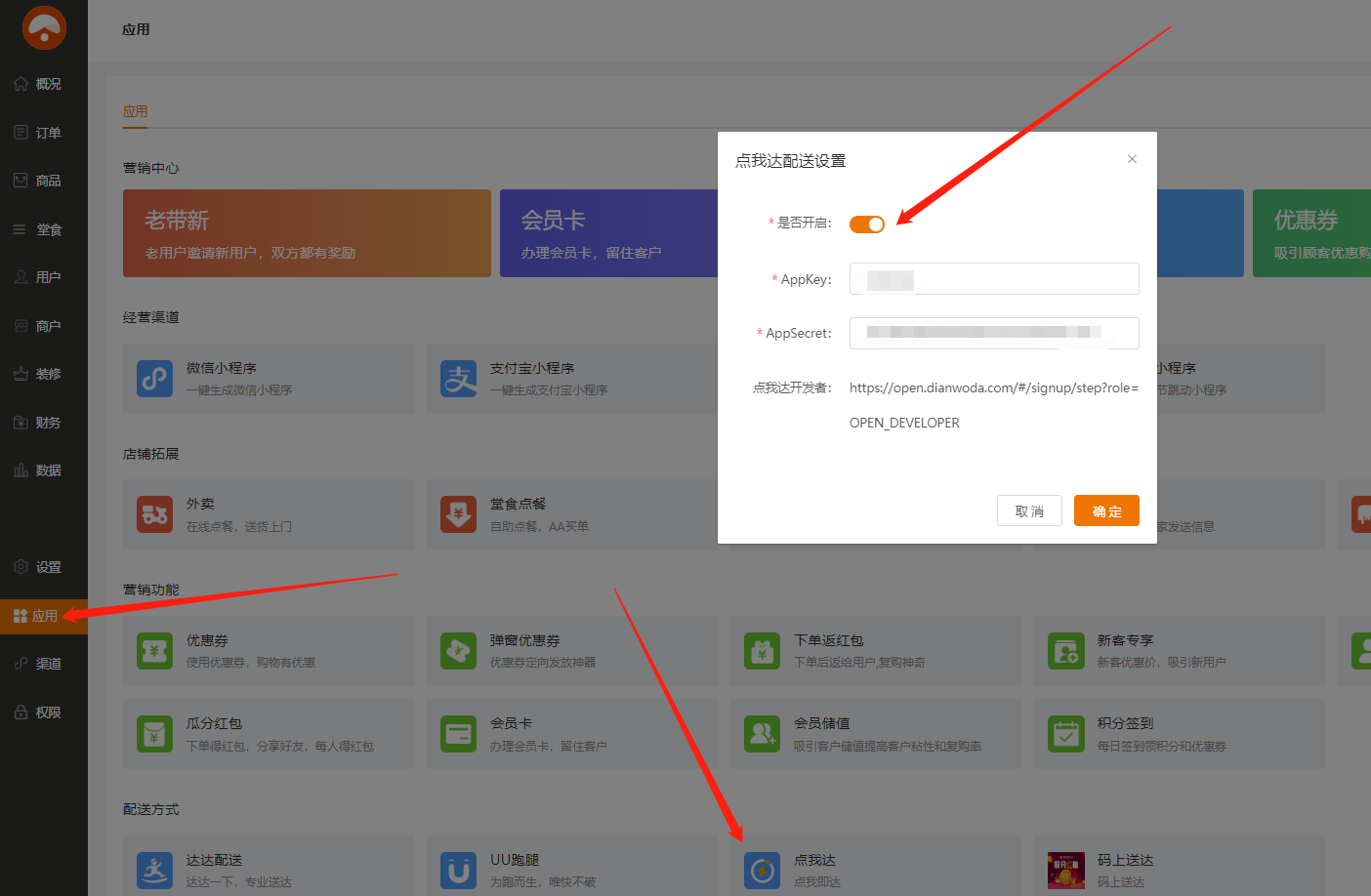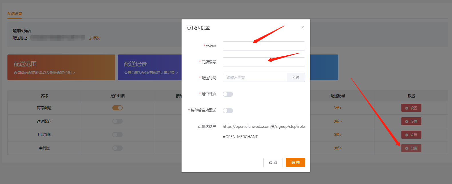 点我达配送申请和对接未来餐厅多端小程序教程 登录点我达开发者后台 https://open.dianwoda.com 将key和密钥填入未来鸟后台 未来餐厅后台路径:未来餐厅后台->应用->配送方式->点我达  点我达后台路径:开发者后台->控制台->我的应用  将商户编号和Token填入未来鸟后台 未来餐厅后台路径:未来餐厅后台->商户->更多->配送设置   点我达后台路径:开发者后台->控制台->授权管理->查看
