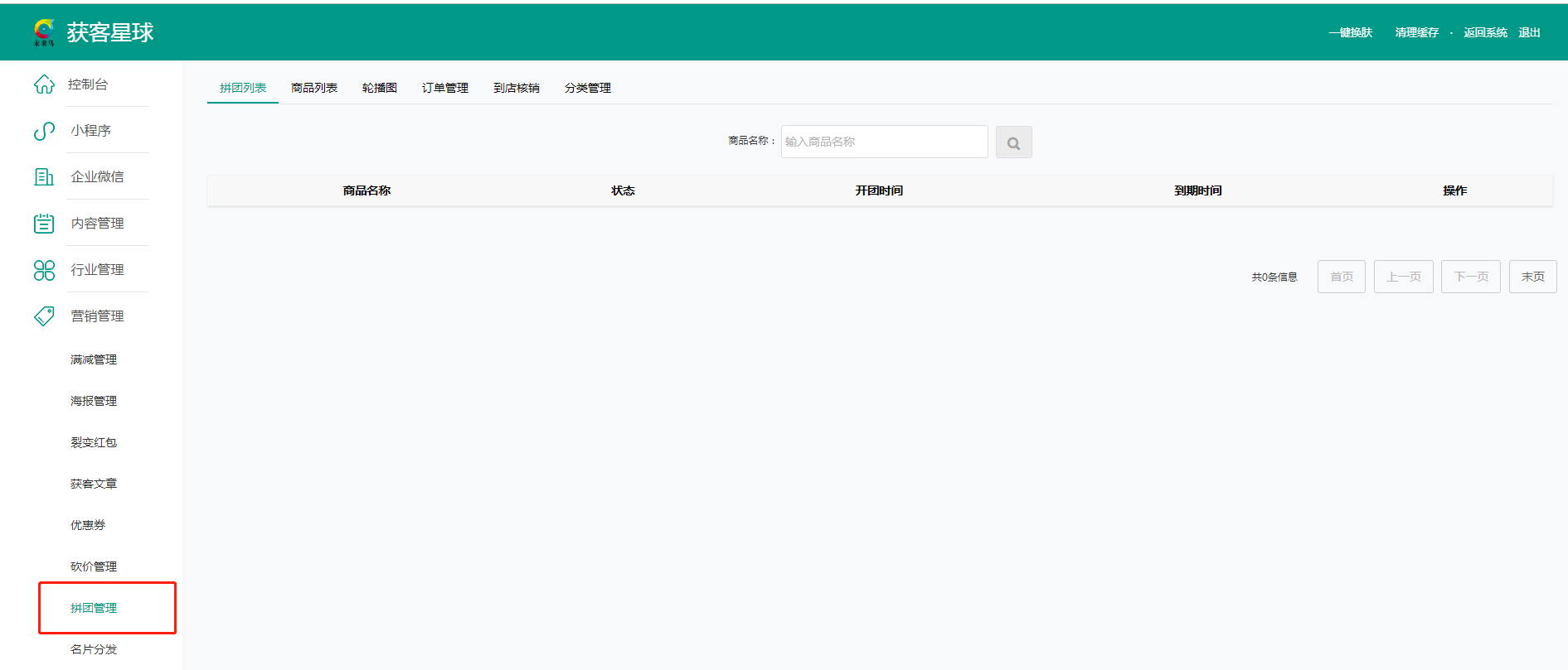 ### 拼团管理  #### 拼团列表:可以显示所有的开团订单,点击“查看团信息”可以查看订单详情。 设置商品前,先进入“分类管理”设置分类。 #### 商品列表:可以新增拼团活动,也可以对已有的活动进行活动信息修改、复制链接等操作。 拼团活动设置好之后,可以在小程序首页或者其他页面编辑并添加活动链接,使用此活动。 #### 轮播图:显示所有轮播图片的信息。该轮播图将显示在拼团首页。 #### 订单管理:界面显示所有的订单信息,可以根据订单状态快速查询订单。 拼团商品可以单独购买,只不过不享受拼团优惠。单独购买的订单,也会显示在拼团订单中。