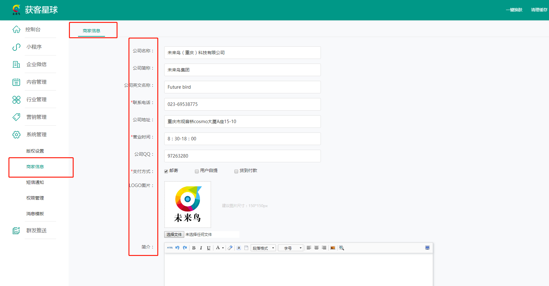 ### 商家信息  填写商家的名称、联系方式、地址等基本信息。商家信息没有详情页,并不记录以往填写的商家信息,不显示修改记录。