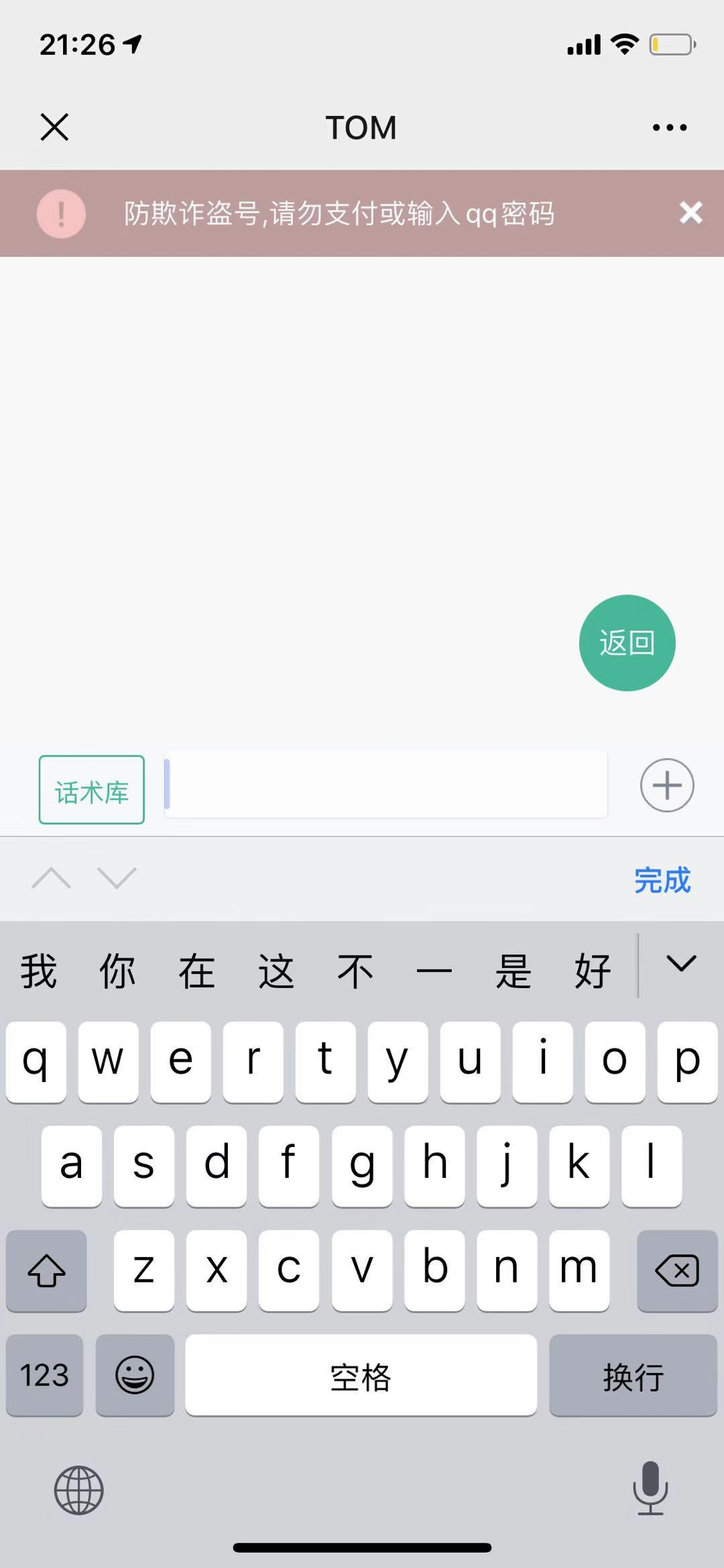 如图所示,在AI雷达里与访问聊天发送信息时,提示“防欺诈盗号,请勿支付或输入QQ密码”,登录认证过的公众号后台,添加业务域名和JS接口安全域名即可(IP白名单)。