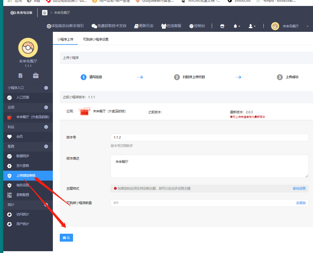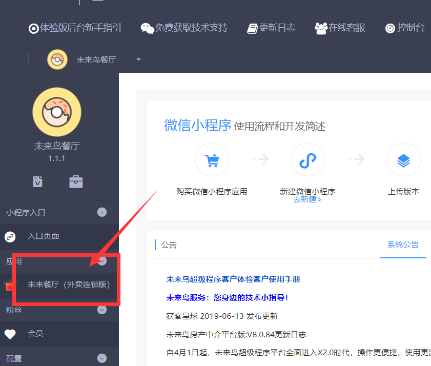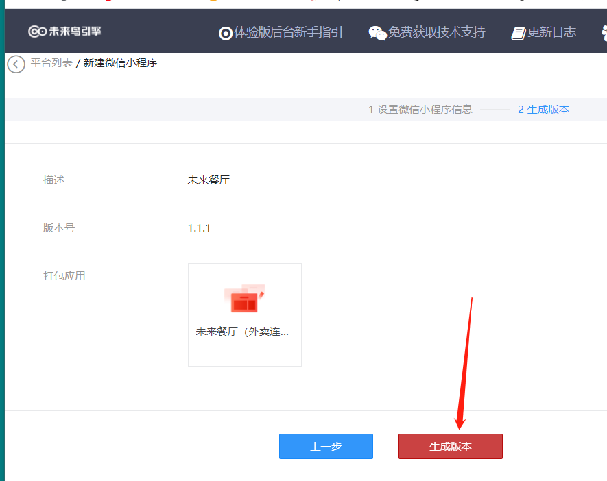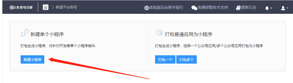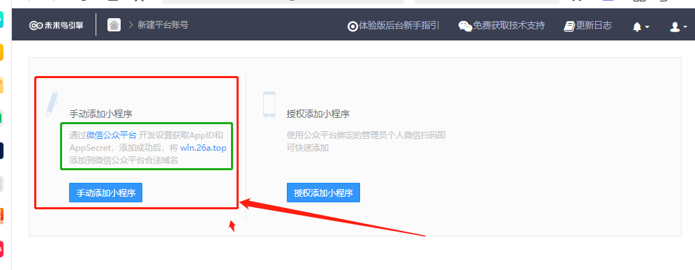 为了方便体验版未来餐厅以及SAAS对接版以及自助服务版用户在试用阶段仅为方便客户体验后台,如需对接体验前台可联系客服帮忙安排指导! 首席服务官微信账号为:`CQWLN2016`  ------------ - 添加应用之前的准备: - `小程序的对接需要您要有一个已认证过的小程序帐号和微信支付帐号` - 如果没有,请按照以下教程来进行申请和认证以及对接! - 服务号小程序以及微信支付的申请认证和对接教程 - 已经有了认证过的小程序帐号和可以按照以下教程进行对接即可! ###### 1.进入平台后,点击添加平台  ###### 2.新建微信小程序  ###### 3.选择手动添加微信小程序 并到微信公众平台后台获取原始 ID,APPID,密钥并把 WLN.26A.TOP 添加到公众平台合法域名中  微信公众平台官网:https://mp.weixin.qq.com/ 原始 ID 和 APPID 获取步骤:【APPID 和原始 ID 可以在小程序后台:设置-基本设置-帐号信息中找到】 小程序的 AppSecret 密钥:【密钥可以在小程序后台:开发-开发设置-开发者 ID 中生成和重置】 服务器域名填写的步骤为:【开发-开发设置-服务器域名-添加或修改】 请务必添加域名 wln.26a.top 五个域名配置都需要添加!完成后的案例如下:  ##### 4.新建单个小程序  ##### 5.输入您获取到原始 ID,APPID,秘钥即可!  ###### 6.选择小程序应用,并生成版本  ###### 7.进入应用的管理 点击左上角未来鸟引擎 LOGO 进入首页,然后进入应用后,填充和管理您新建的小程序应用  ###### 8.应用的设置和内容的填充 当您填充完毕以后,如果您的小程序需要支付和退款功能,请点击支付参数,添加在微信支付后台获取到支付信息,如果不需要支付,请忽略本步骤  ###### 9.上传微信审核  如果有需要跳转的小程序,请填写要跳转的小程序数量和 APPID 等信息,如果没有,请点击确认即可扫码上传,上传成功以后,到微信后台提交审核,审核通过以后,全量发布即可! `【注意,如果您的小程序没有申请开通直播功能,请不要选择直播组件】`