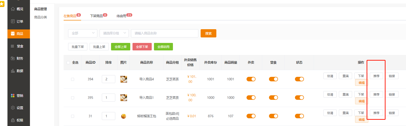 推荐商品怎么设置? *** 商家后台推荐 路径:商户后台-商品列表 作用:推荐的商品在商家首页会有单独显示的地方