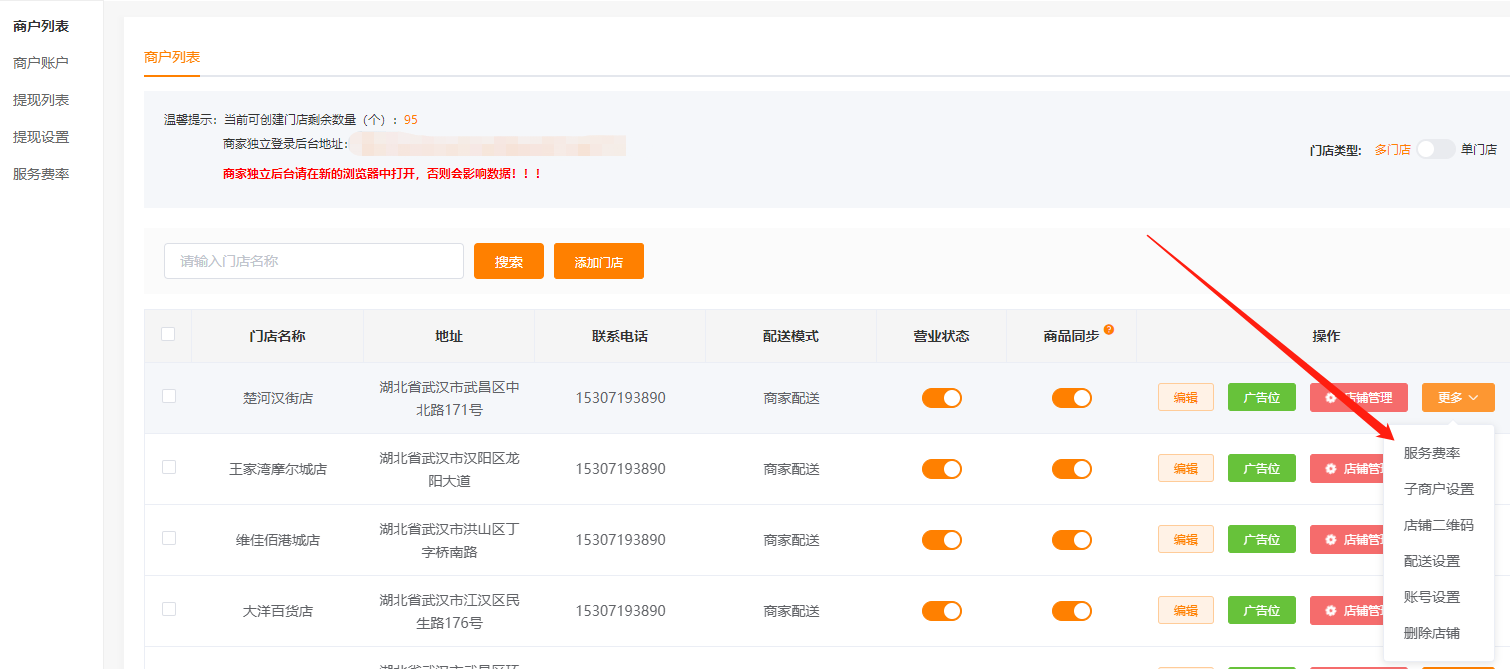 商户如何设置单独的服务费率? 必须要在关闭同步平台服务费率的情况下才能单独设置商户服务费率 路径:商户列表->更多->服务费率