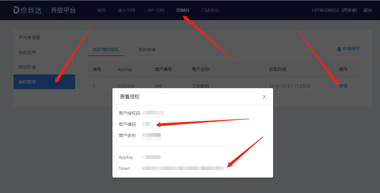 点我达配送申请和对接未来餐厅多端小程序教程 登录点我达开发者后台 https://open.dianwoda.com 将key和密钥填入未来鸟后台 未来餐厅后台路径:未来餐厅后台->应用->配送方式->点我达  点我达后台路径:开发者后台->控制台->我的应用  将商户编号和Token填入未来鸟后台 未来餐厅后台路径:未来餐厅后台->商户->更多->配送设置   点我达后台路径:开发者后台->控制台->授权管理->查看