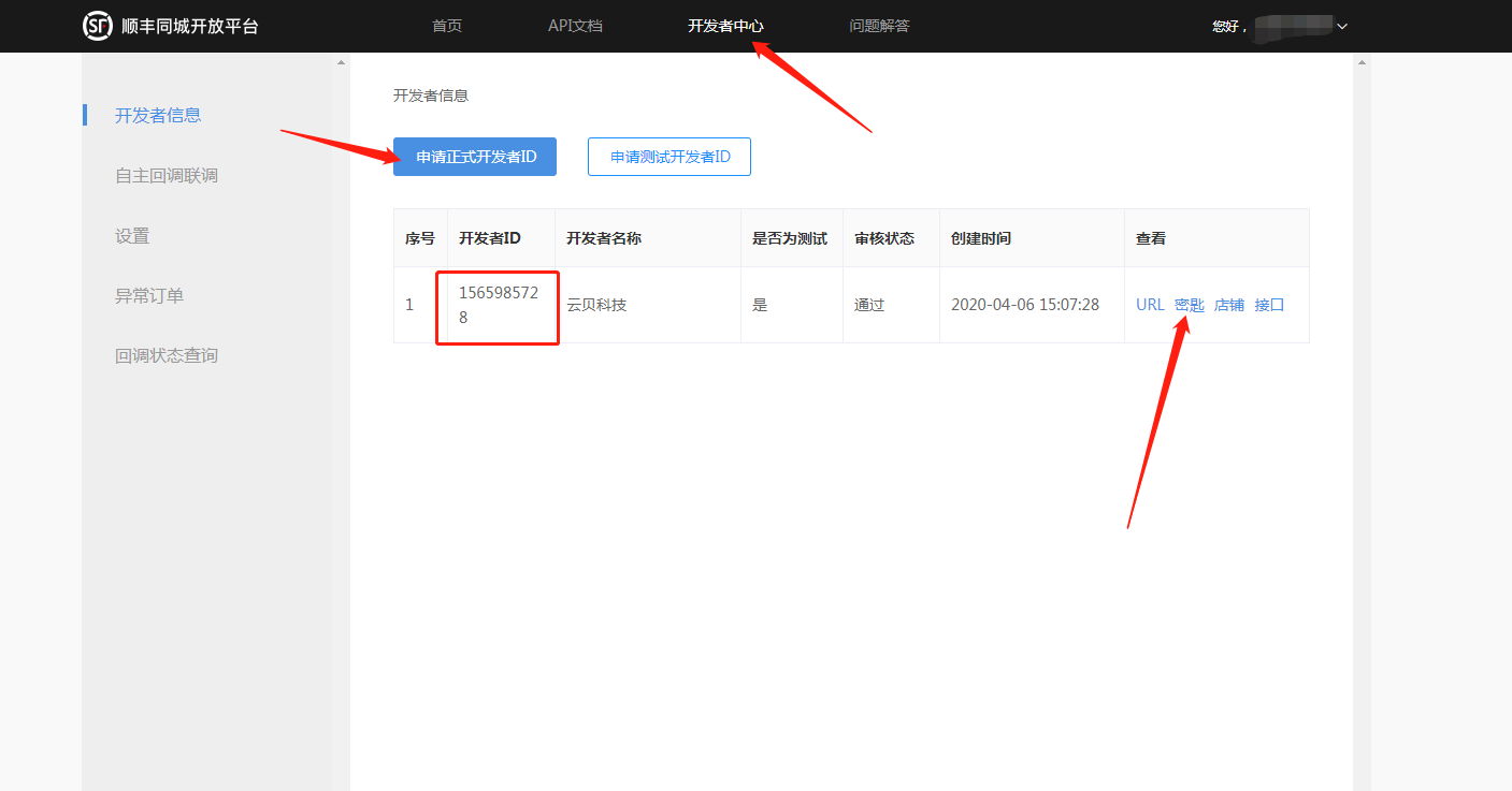 第一步:登录顺丰开发平台 首先登陆 http://commit-openic.sf-express.com/open/api/docs/index#/homepage 或者点击入未来餐厅后台->应用->配送方式->顺丰配送,也可以显示登录地址  然后注册登录顺封同城开发平台 登录后点击开发者中心  第二步:申请开发者 然后复制开发者ID和密钥  填写到未来餐厅顺丰后台  第三步:点击URL 填写https://wln.26a.top/addons/yb_cy/payment/peisong/shunfengnotify.php   第四步:创建店铺 输入跟当地顺风对接的店铺ID   然后在餐饮后台商户-配送设置这里启用顺丰,并输入商户ID保存即可  这样就对接完成啦!