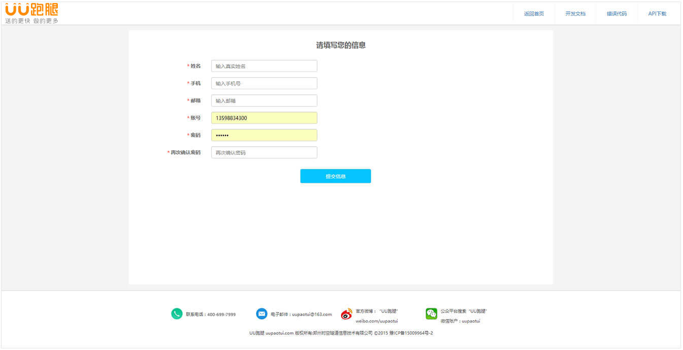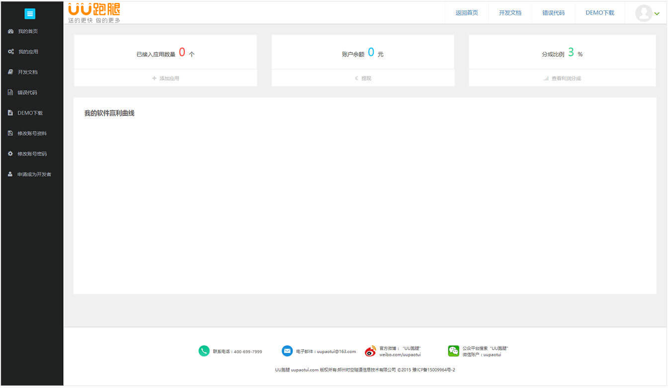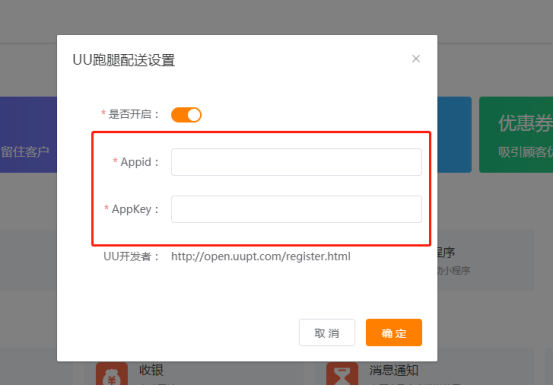 首先注册UU商家账号和UU开放平台账号 注册商家平台 1.注册UU跑腿商家平台账号(shangjia.uupt.com) 注册开放平台 2.注册UU跑腿开放平台账号(open.uupt.com)  2.注册成功后登录,进入“我的首页”  添加应用 1.点击右边菜单栏“我的应用” 2.添加需要对接的网站、APP、WINDOWS、获取Appkey  然后打开未来餐厅后台      复制appid key openid填到对应的地方即可,要保证商户后台有钱才会正常发单