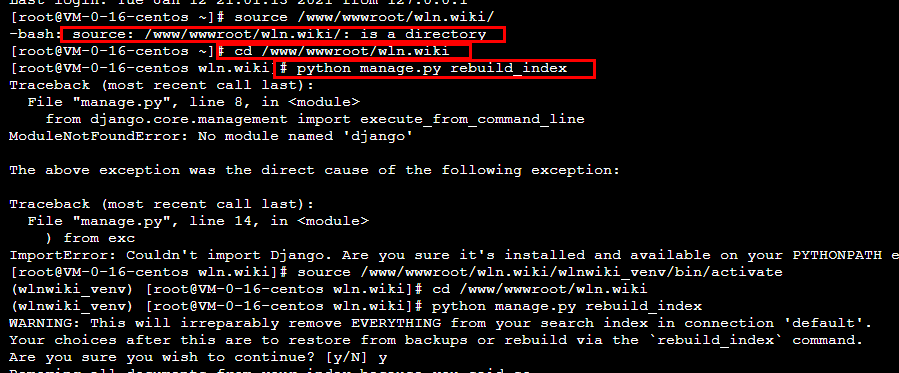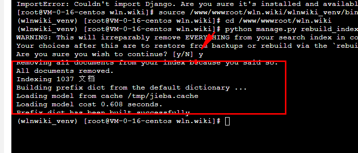 在使用全文搜索之前需要对文档创建索引在 BT 终端 输入以下命令 ``` source /www/wwwroot/wln.wiki/wlnwiki_venv/bin/activate ``` ``` cd /www/wwwroot/wln.wiki ``` ``` python manage.py rebuild_index ``` 根据终端输出提示,输入 `y`,回车,等待文档索引创建完成。