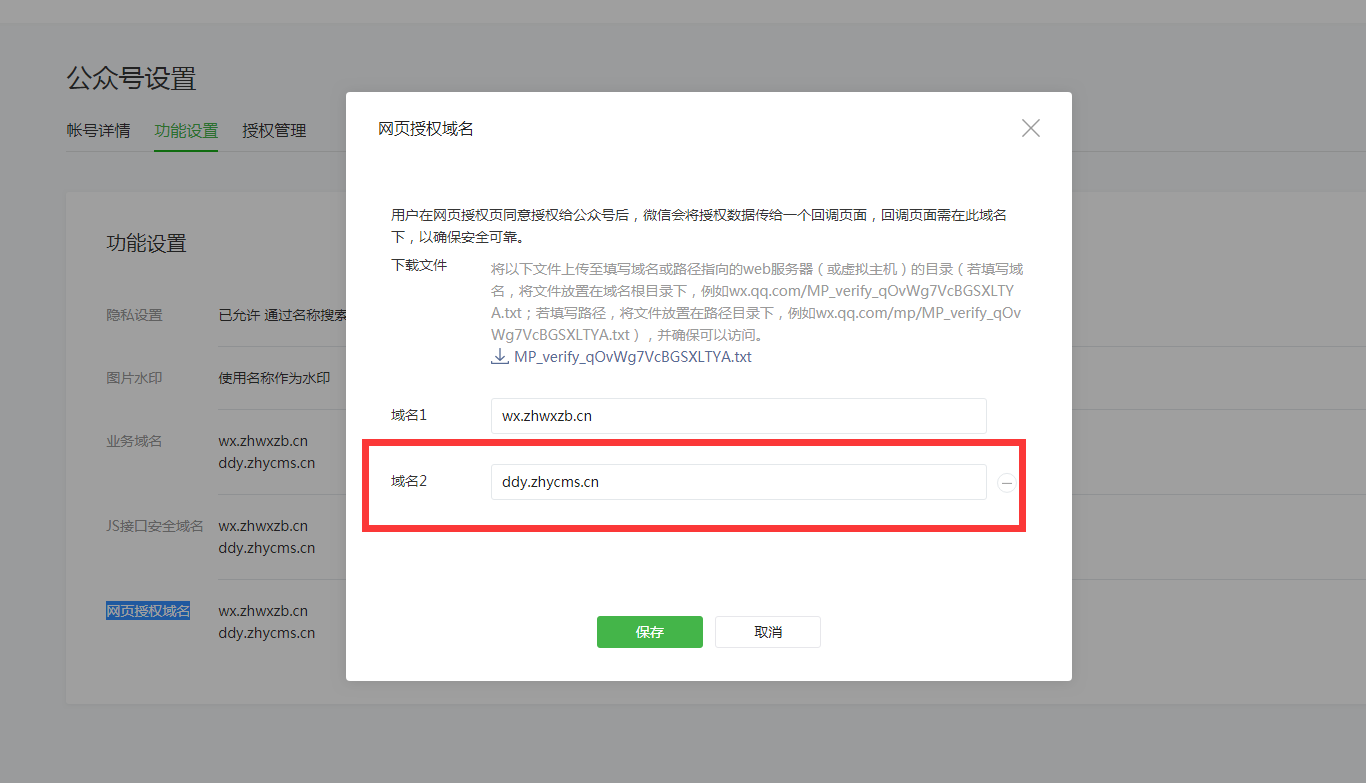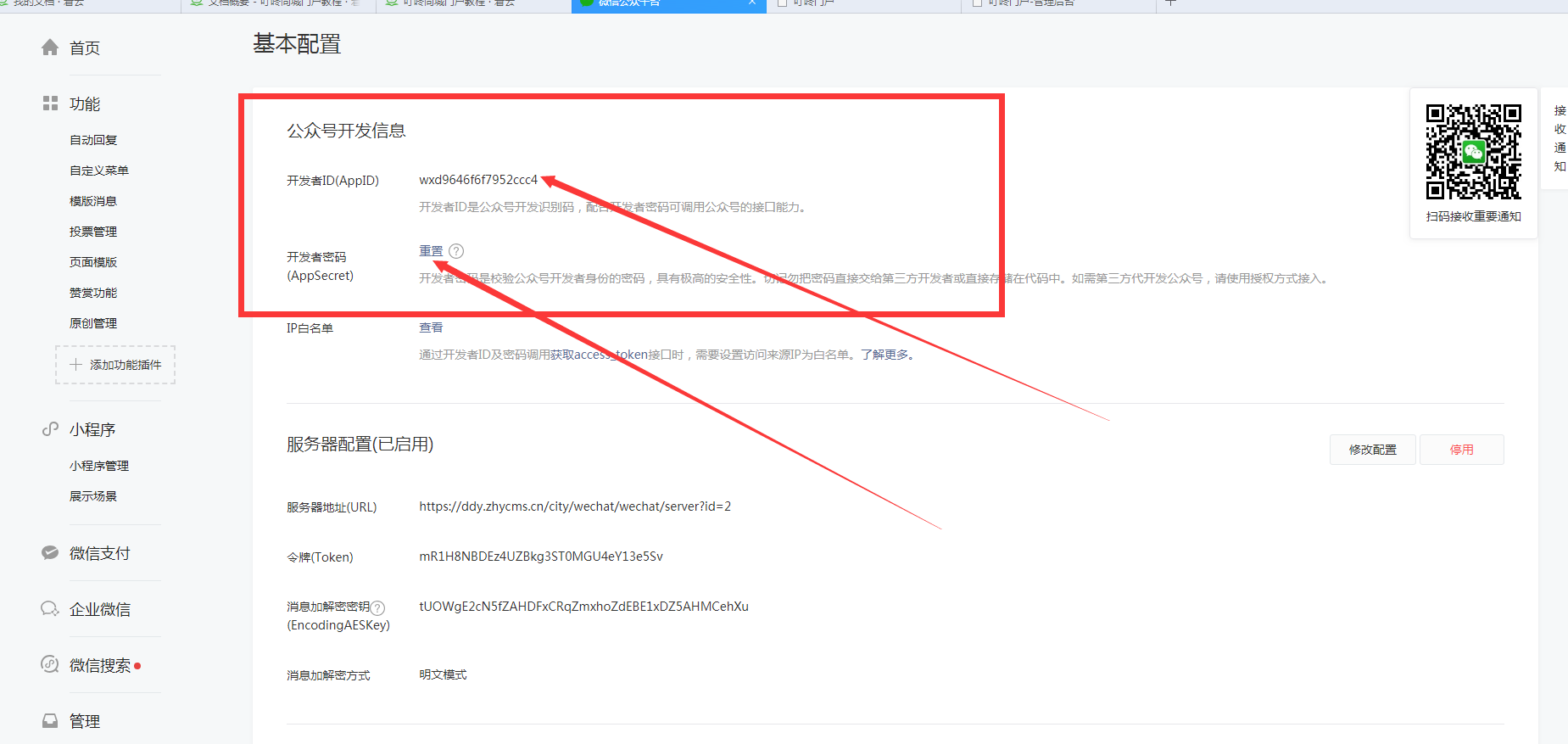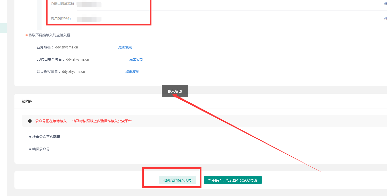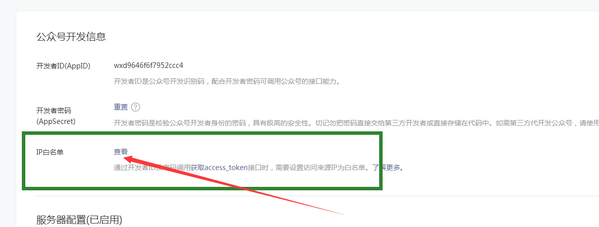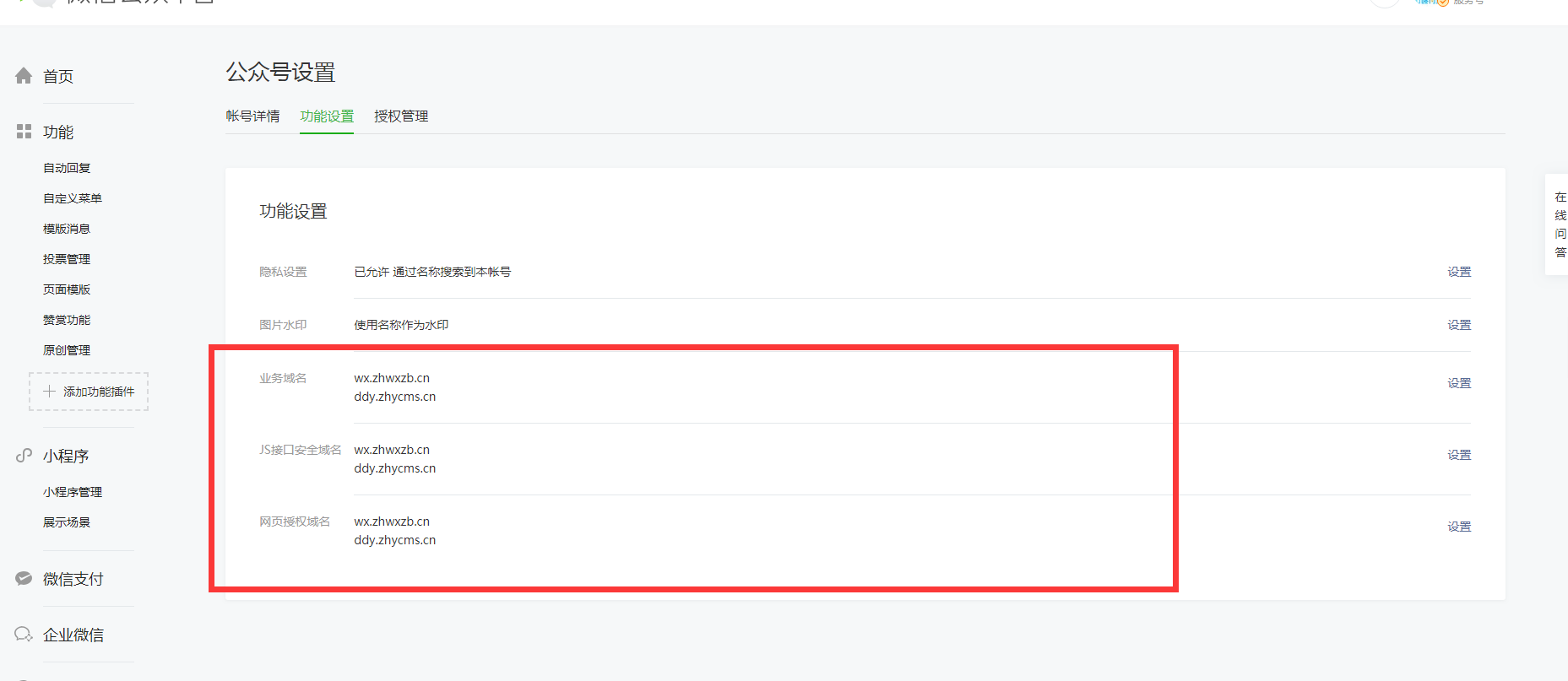 ### 完成公众号关联同城门户后台配置: #### 第一步:打开未来鸟同城门户,进入管理后台,菜单—版本—公众号,依次填写相关信息  微信公众号APPID和AppSecret获取数据如下,登陆微信公众号平台(https://mp.weixin.qq.com)  #### 点击微信公众号左边菜单开发—基本设置   #### 第二步,将你服务器的IP填写到IP白名单中,保存一下   #### 第三步,点击微信公众号左边菜单设置—公众号设置—功能设置,将txt验证文件上传到未来鸟同城门户后台   同时将你的域名依次写在业务域名、JS接口安全域名、网页授权域名中,保存即可   点击下一步,请将如下网址依次填写到微信公众号左边菜单开发—基本设置中的### 服务器配置中,启用即可   最后一步:检测是否接入成功,如提示显示接入成功,则公众号已完美接入成功