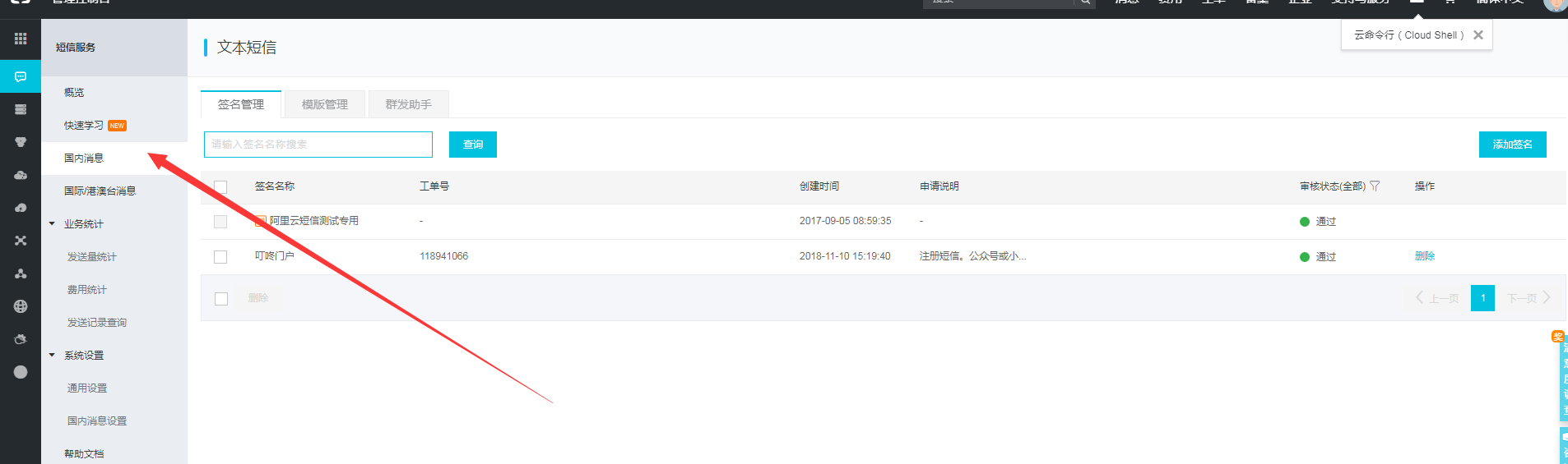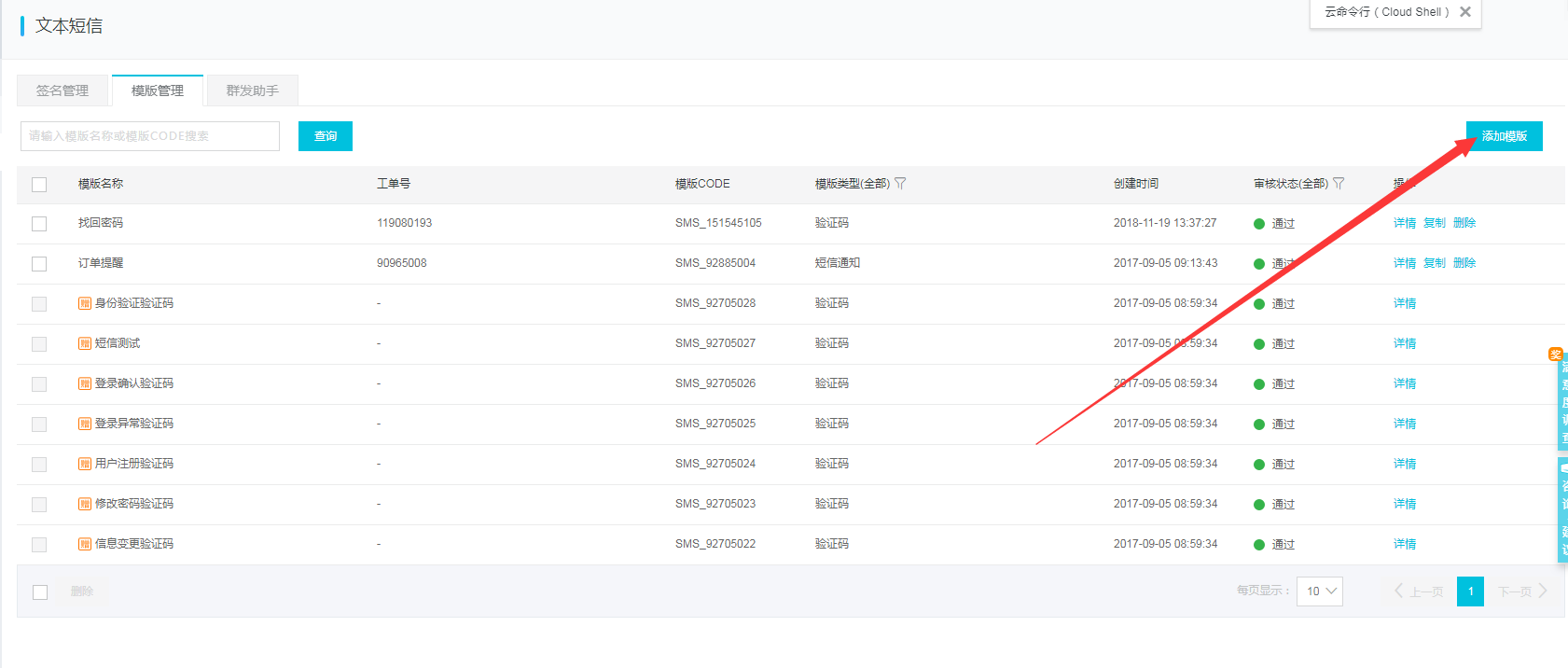 ### 阿里云短信配置 #### 第一步:打开阿里云官网(https://www.aliyun.com/),点击登录,购买阿里云短信。  #### 第二步:鼠标移动到右上角头像处,点击accessKey  如果没有accessKey点击新建即可   将AccessKey ID和Access Key Secret复制到**:“设置—提醒—短信设置”**处 #### 第三步:进入阿里云短信管理-国内短信,添加一个签名,按要求上传相关资料   #### 第四步:添加一个短信模版,按照自己的需求选择即可   #### 第五步:短信签名和短信模版审核通过之后