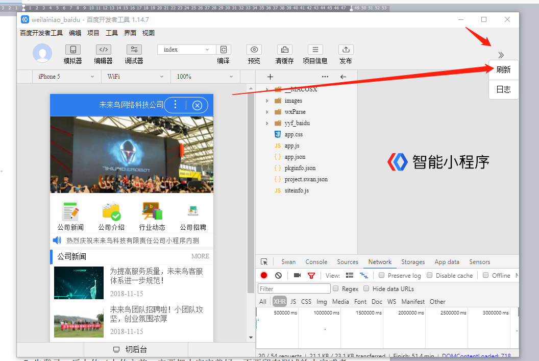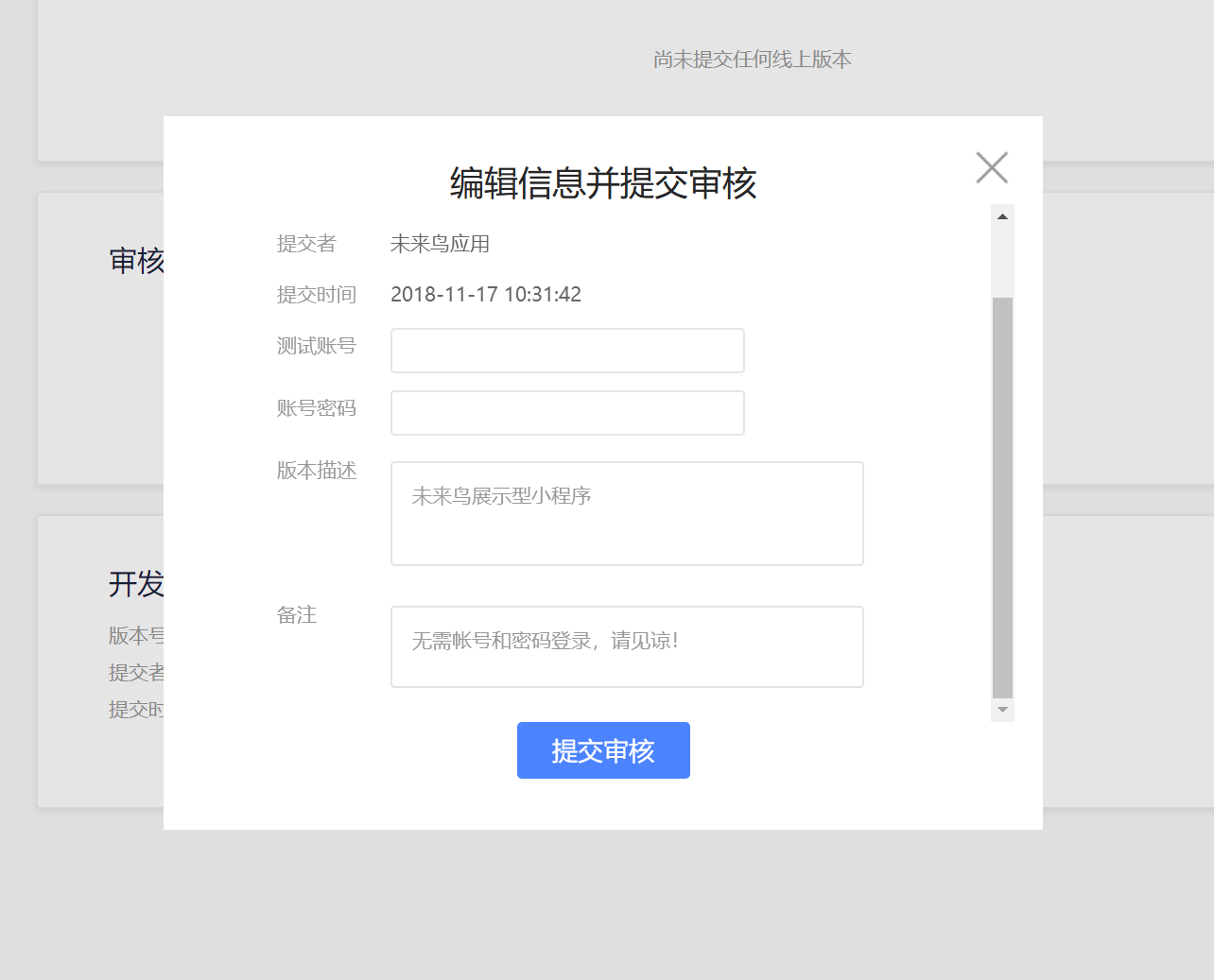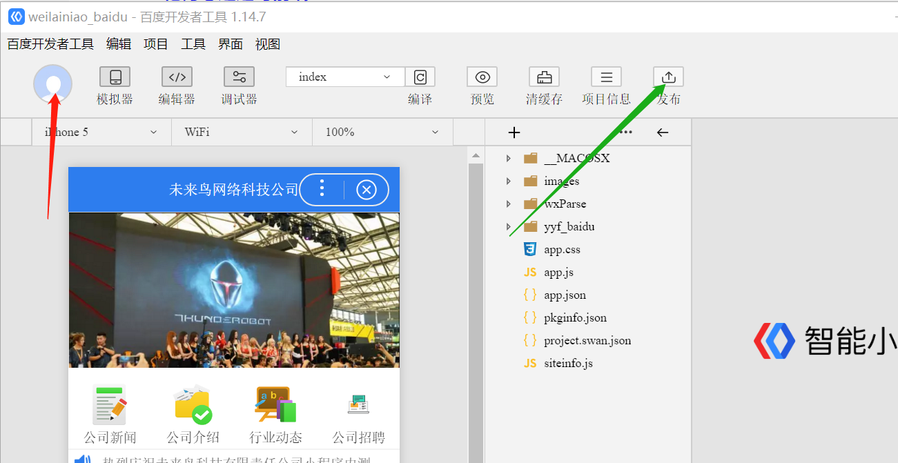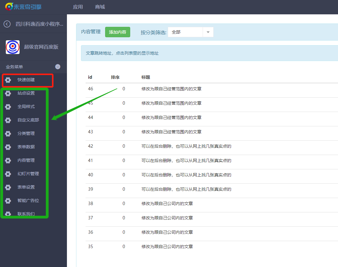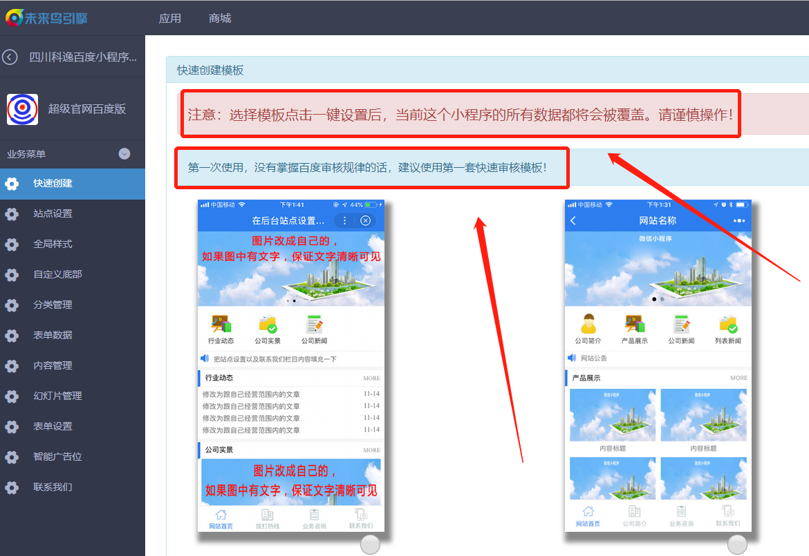 [TOC] ### 一.下载:开发者工具 下载开发者工具([Windows 内测下载地址](http://smartapp.baidu.com/mappconsole/api/devDownload?system=windows&type=beta "Windows 内测下载地址") | [Mac 内测下载地址](http://smartapp.baidu.com/mappconsole/api/devDownload?system=mac&type=beta "Mac 内测下载地址"))进行代码的开发和上传。  ### 三.代码的上传和过审教程 ##### 1.请整理以下资料发给我们的售后部门工作人员 让研发部门为您这边写前端! 小程序资料 APPID: KEY: APPSecrer: (如何获取请查看第一个教程) ##### 2.提交小程序资料30分钟以后,请联系未来鸟售后部门获取最新版前端代码 然后把代码解压到D盘根目录,不要用中文目录,否则会报错!  解压后文件如下! ##### 3.打开百度开发者工具,选择打开  ##### 4.登录未来鸟应用后台 https://wln.26a.top/ 登录您的帐号和密码 然后选择售后部为您搭建好的百度超级官网小程序应用  到这里,绿框内的内容您都可以自由编辑,在过审之前,不要选择红色“快速创建”中的其他模版到这里,绿框内的内容您都可以自由编辑,在过审之前,不要选择红色“快速创建”中的其他模版  为您创建的第一个模版是,一个快速过审模版。等过审发布完毕以后,您可以自由编辑内容和更换模版!  ##### 5.如何在前端查看您修改的内容? 在后台更新了内容以后,点击刷新,即可在前端预览您发布和修改的的内容  ##### 6.百度官方小程序审核注意事项 1.名称 一般营业执照的名称是稳过的。其他名称如果不是很着急上线,可以尝试几次。早上提交,下午5点左右一般能给回复审核结果。 如果是新手或者嫌麻烦,可以直接使用系统快速创建的第一套过审核模板,填充后,修改内容即可!下方内容可以忽略。 2.内容:内容一定要符合自己的经营范围内的具体内容。不要直接用测试数据或者空白提交。 (推荐创建公司新闻,行业动态两个新闻栏目。其他具体内容发布后,再创建。最大化让审核人员挑不出涉嫌商业招商推广等毛病) 3.另外单页面展示类型的分类全部隐藏掉。例如公司简介等。等审核通过再显示。 查看和隐藏方法:分类管理-》修改分类-》如果是单页面或者视频展示类型,全部隐藏掉!  内容全部完善以后就可以进行登录和上传了 ##### 7.先登录,后上传(上传之前一定要把内容完善好,不要留有测试的内容或者空白)。登录需要手机安装百度APP,然后扫码。 上传完毕以后,去百度小程序官网后台进行提交审核  ##### 8.上传后,登录官方后台提交审核,等待审核通过后,发布即可 选择您的百度小程序  然后进入——平台首页>开发管理  提交审核即可  如果审核通过,请直接提交全量发布即可 如果审核不通过,请选择撤回当前版本,然后按照提示进行修改  然后重复本教程的5.6.7.8段教程重新提交审核即可! 注意尽量按照他们的要求整改!百度的审核会非常严格,基本上需要审核好几次!