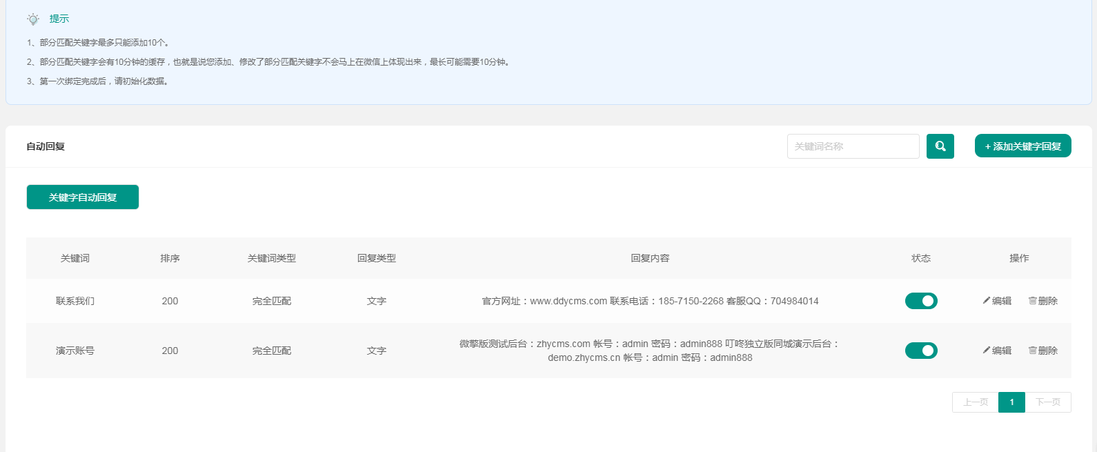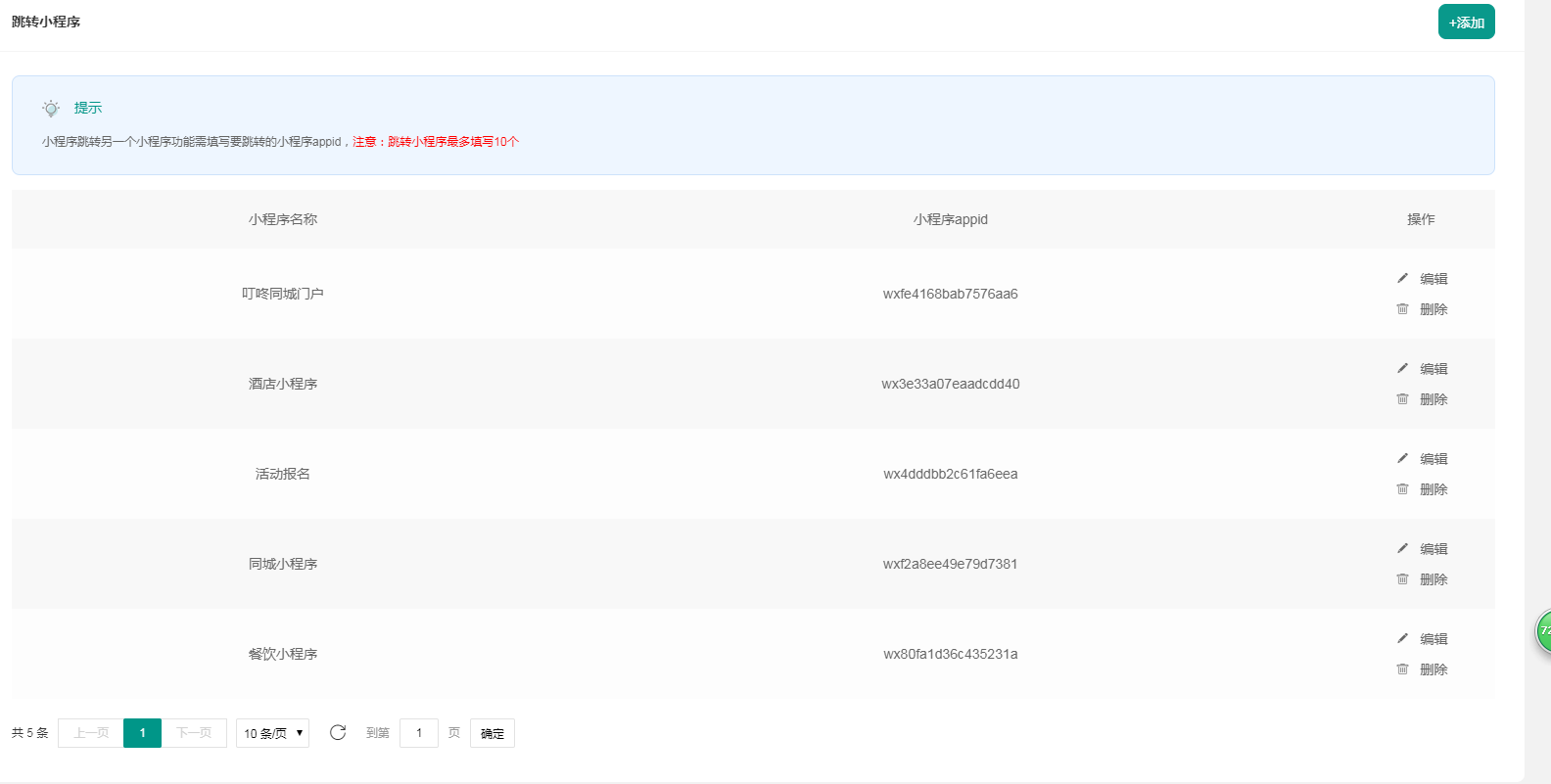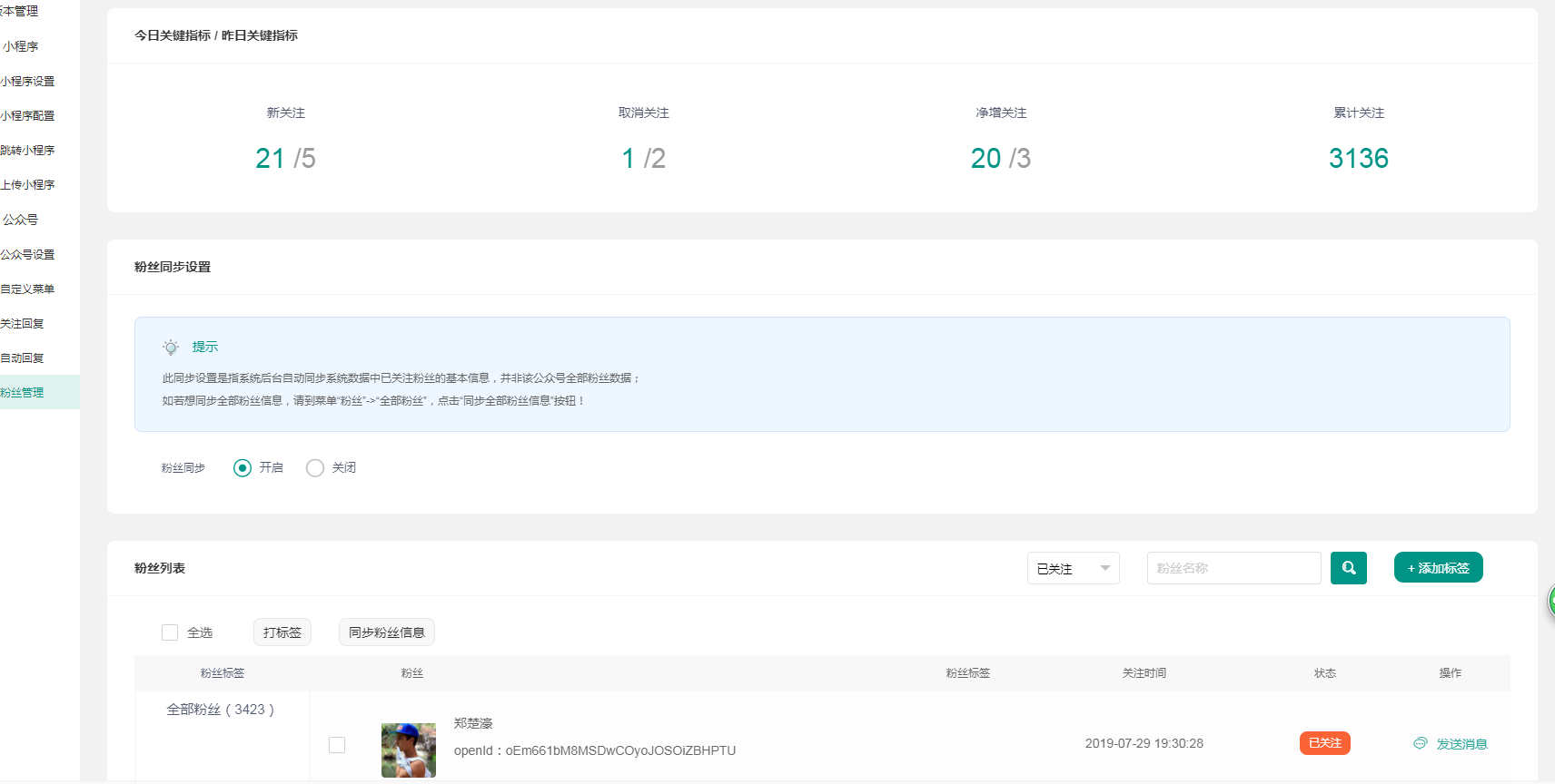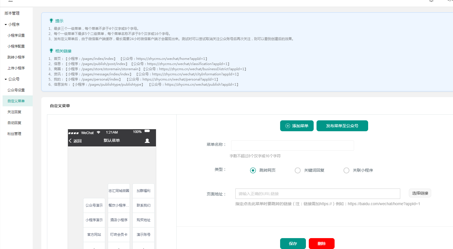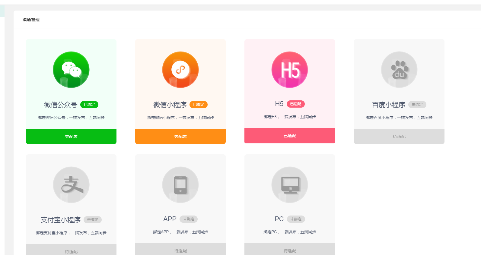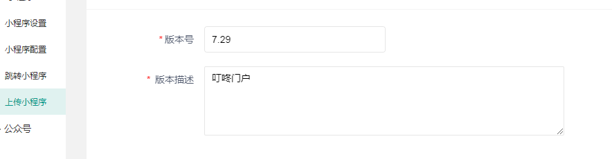 目前已经开放了公众号、小程序和H5 公众号和小程序需要配置,H5不需要配置可直接打开 公众号和小程序配置教程见上面  在小程序配置里可禁用苹果支付  如果要跳转小程序,需要在这里添加另外小程序的appid 注意:跳转小程序最多填写10个  小程序上传,填写版本号和版本描述,然后扫码和即可上传代码 上传代码后需要登录官方小程序进行提交审核 公众号自定义菜单  连接都在提示这里 1、最多三个一级菜单,每个菜单不多于4个汉字或8个字母。 2、每个一级菜单下最多5个二级菜单,每个菜单名称不多于8个汉字或16个字母。 3、发布定义菜单后,由于微信客户端缓存,最长需要24小时微信客户端才会展现出来。测试时可以尝试取消关注公众账号后再次关注,则可以看到创建后的效果。 菜单可跳转网页、关键字回复和关联的小程序 关注回复  设置后,新用户关注后可自动回复用户 关键字回复  1、部分匹配关键字最多只能添加10个。 2、部分匹配关键字会有10分钟的缓存,也就是说您添加、修改了部分匹配关键字不会马上在微信上体现出来,最长可能需要10分钟。 3、第一次绑定完成后,请初始化数据。  填写完后可在公众号进行回复测试 粉丝管理,这里可以查看关注的用户 点击开启同步,公众号的粉丝自动会同步到叮咚门户上 此同步设置是指系统后台自动同步系统数据中已关注粉丝的基本信息,并非该公众号全部粉丝数据; 如若想同步全部粉丝信息,请到菜单“粉丝”->“全部粉丝”,点击“同步全部粉丝信息”按钮!