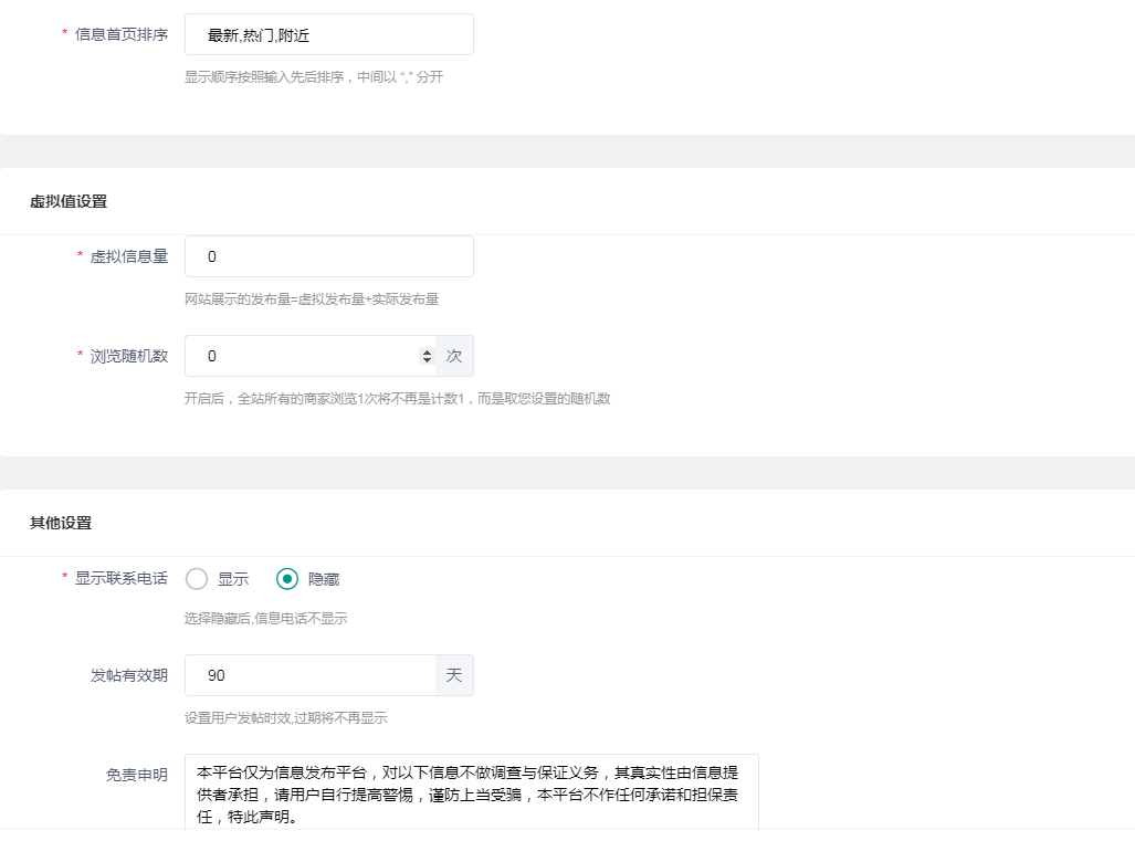### 信息设置 _1610616995.jpg) 全国发帖,开启后用户可以选择发全国贴,全国城市都能看到 信息字段,这个可以自定义信息两个字,比如改成帖子,那么所有的信息都叫帖子 信息审核,开启则需要人工审核,关闭则不需要 发帖限制,开启后可限制每人每天发帖数量,关闭则没限制 信息置顶,如选择关闭,信息将无法置顶 发帖类型,后台只能发图文 显示区域显示设置,模式一为区发布的信息可在市显示,市发布的信息只能在市显示,模式二为区发布的信息可在市显示,市发布的信息也可在区显示 信息审核开关、评论审核开关 信息首页排序,默认为最新,热门,附近 显示顺序按照输入先后排序,中间以 “,” 分开  虚拟信息量,显示在信息页面  浏览随机数,开启后,全站所有的商家浏览1次将不再是计数1,而是取您设置的随机数 联系电话可以选择隐藏,发的帖子也可以设置有效期,免责申明可百度查询
