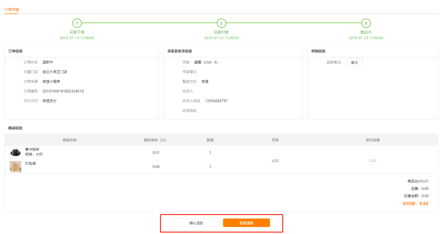 只有待接单、待发货、已发货 状态的订单,用户可以申请退款 功能路径:未来鸟连锁餐厅后天>>订单>>售后订单  点击“查看”可以查看退款订单详情,进行“同意”或者“拒绝”退款操作  同意 的话则 退款成功,拒绝 的话需要填写拒绝理由,之后订单关闭。