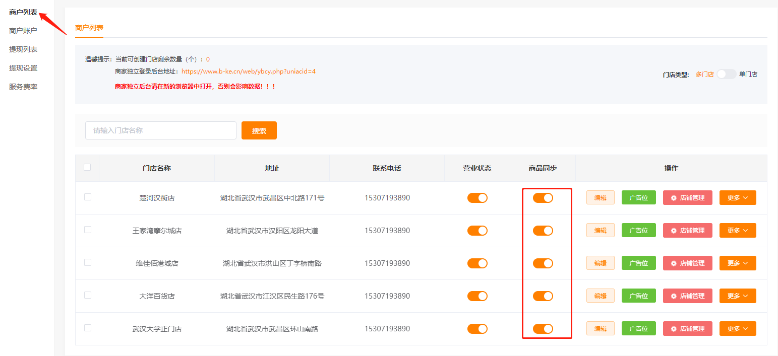 功能路径:后台>>商品>>商品同步 功能介绍:针对有多家门店的商家,推出了多门店同步的功能,主要解决主门店的商品可以直接同步到其他门店。 知识点:必须是开启了多门店才会有门店同步功能 功能设置: 1、点击进入商户管理页面,点击商品同步开关  2、不想同步的话点击开关关闭同步即可 3、没有同步的商户,平台新增加的商品在改商户里没有显示,需进入商户保存一下商品后点击开启状态才会显示