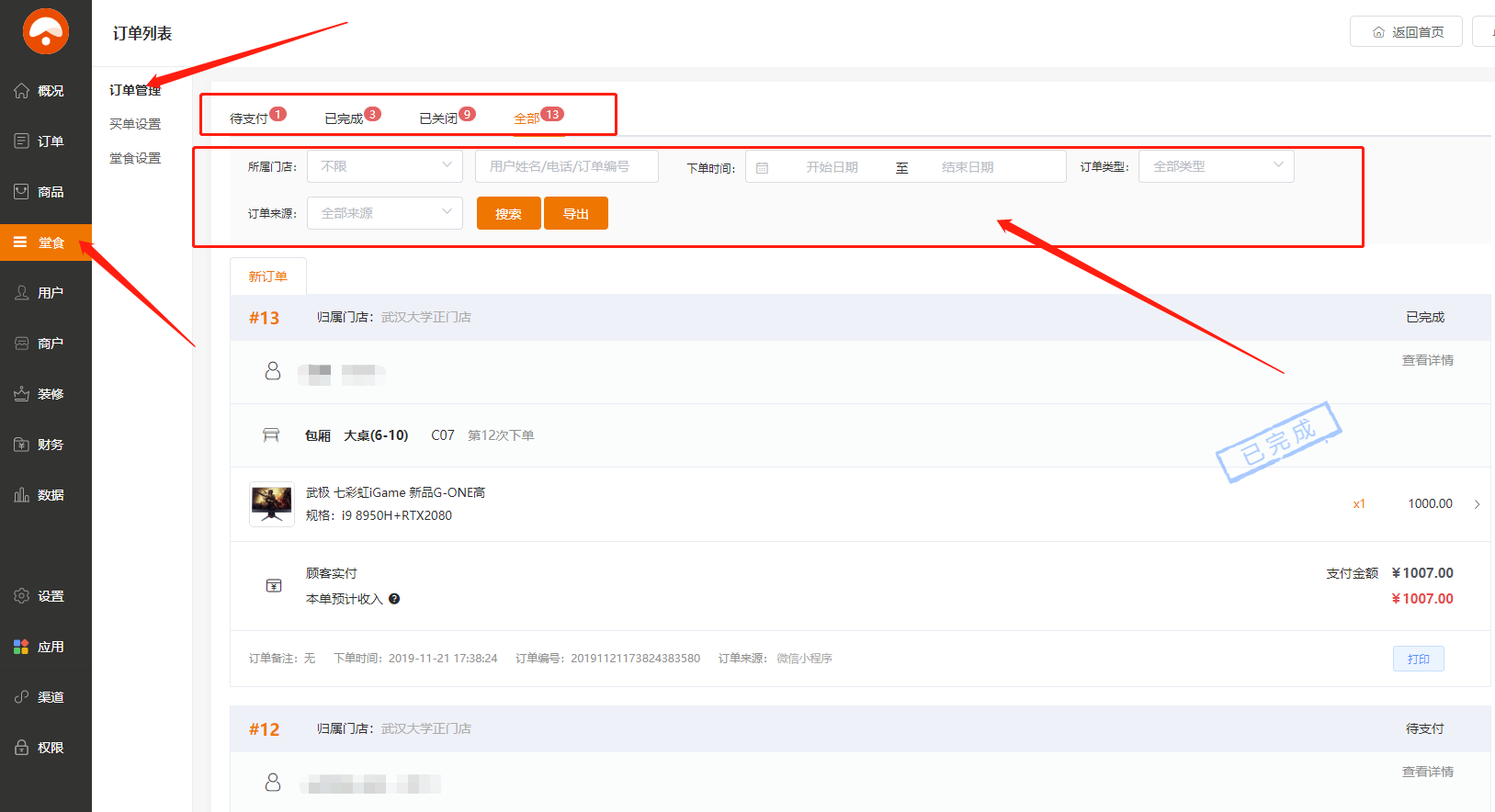 路径:后台->堂食->订单管理 堂食订单单独在堂食模块查看,分为待支付,已完成和已关闭订单 可以通过筛选条件:门店,用户姓名、电话、订单编号、下单时间、订单类型和订单来源来查找订单