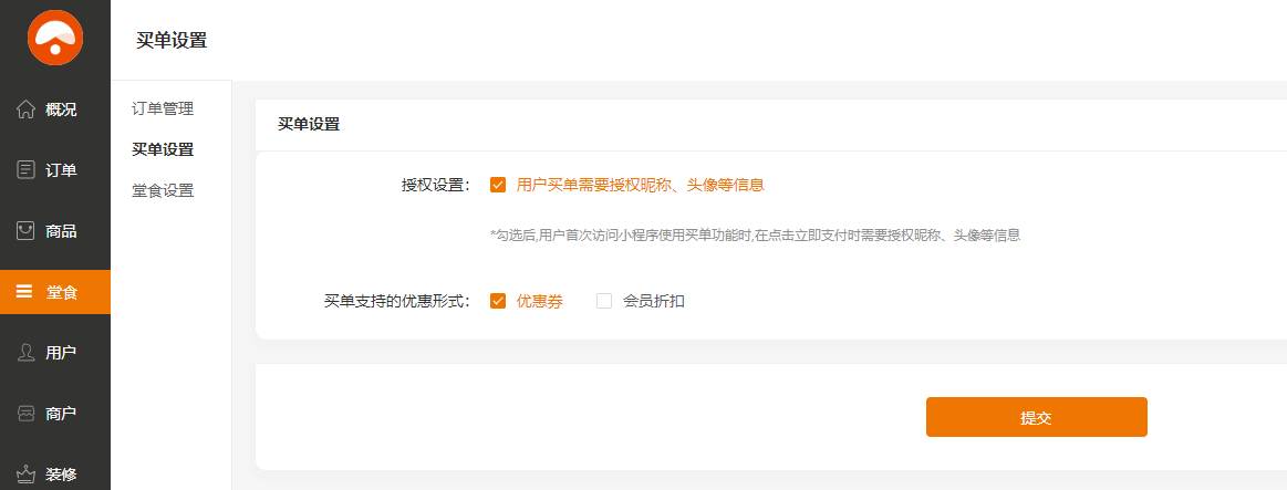 路径:后台->堂食->买单设置 堂食可设置买单授权,勾选后,用户首次访问小程序使用买单功能时,在点击立即支付时需要授权昵称、头像等信息 堂食买单支持优惠券和会员折扣两种优惠,管理员可以自定义选择