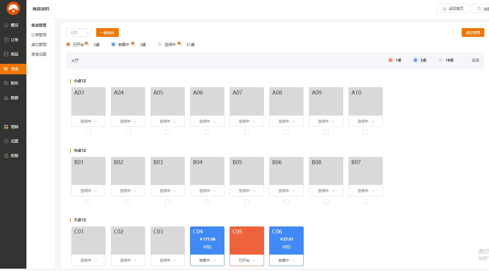 路径:商户后台->堂食->桌位设置 商户可在后台管理桌位,包括新增就餐区域、桌位;管理桌位状态,进行开台、清台等操作,实时查看桌位情况 # 桌位管理 新建桌位需要先创建就餐区域和桌位类型    # 餐桌管理 已添加的桌位可在商户后台查看和修改状态