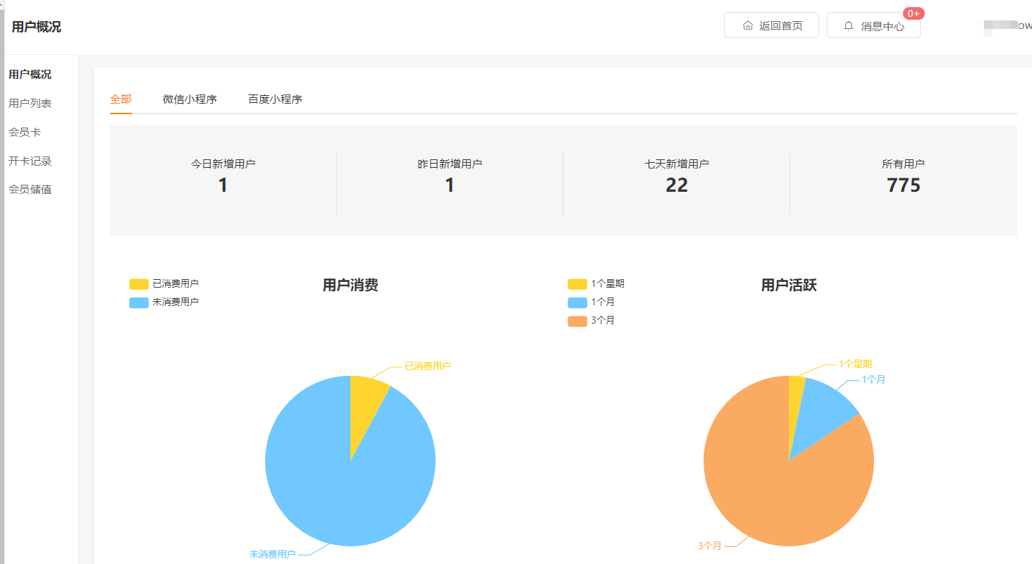 # 用户概况 小程序规则:只要一个用户点击了您的小程序,那么它就是您的会员了。 “会员概况”里包括:不同时间内新增会员数量、消费会员占比以及会员活跃度分布示意图。 您可以根据这些数据,来调整小程序及商品的推广营销策略。  ------------ # 用户管理 功能路径:后台>>用户>>用户管理 介绍:这里的会员信息是指进入到小程序中的用户,用户确认授权后,可以获取到昵称、性别等信息,包括领取了会员卡的用户(但不仅限于领了会员卡的用户) 填写了手机号码的用户。商家可以给此类用户充值余额。  点击“查看”,可以见到单个用户信息和购买记录、统计信息。