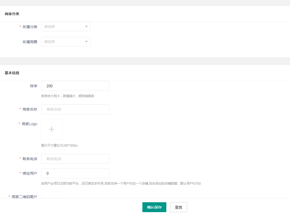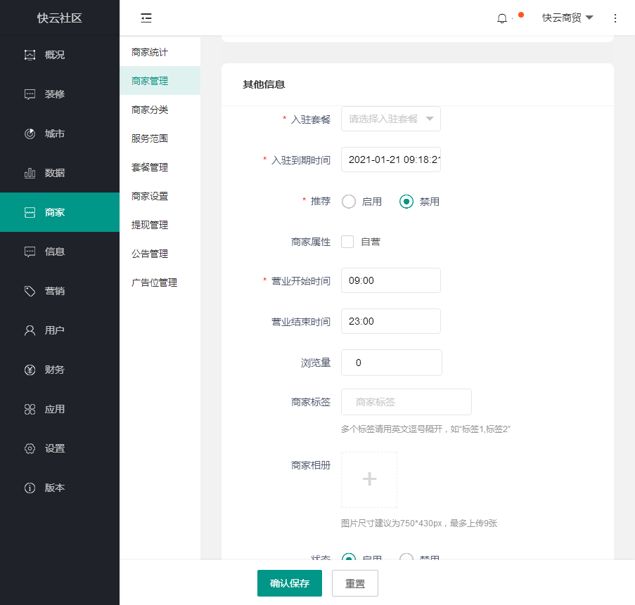 ### 商家管理 #### 商家管理可查看所有商家,在这里我们可以查看商家的信息,及审核商家,和修改商家信息,操作工具和信息一样 _1610586835.jpg)  点击待审核可审核信息,点击进入,可以进入商家管理界面  复制登录地址可登录商家PC版独立后台 如果没有设置管理员的,点击增加管理员即可添加一个,即可登录管理商家后台  点击编辑可以修改商家信息 点击添加,填写信息  先选分类,在选商圈,带星号的都是必填项,没有带星号的建议也填上,绑定用户,这里填用户的ID即可  商家介绍,填写文字,视频连接地址,VR视频连接地址,公众号可以直接跳,小程序必须设置业务域名之后才能跳转,地址和信息是样的,出坐标之后再进行下一步  入驻套餐,如果没有设置套餐需要先设置套餐 到期时间,启用禁用,目前商家只有一种属性 浏览量,营业时间,商家标签、  设置完之后点击保存即可
