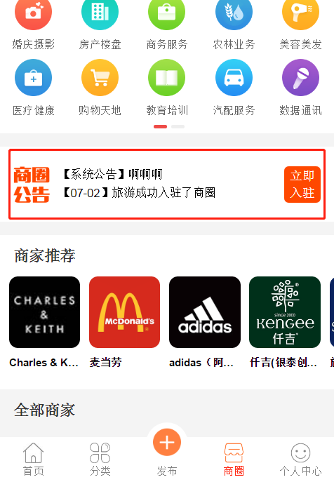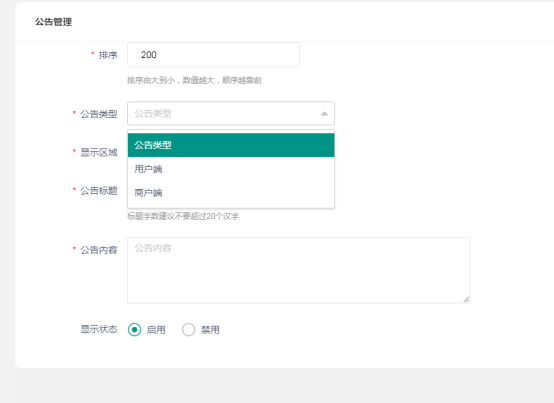 ### 公告管理 这里的公告分为两个类型,商家端和用户端 商家端的公告在商家中心显示,用户端的公告在用户端显示 公告也可以设置显示区域,可以对不同的地区发布不同的公告 _1610588008.jpg)